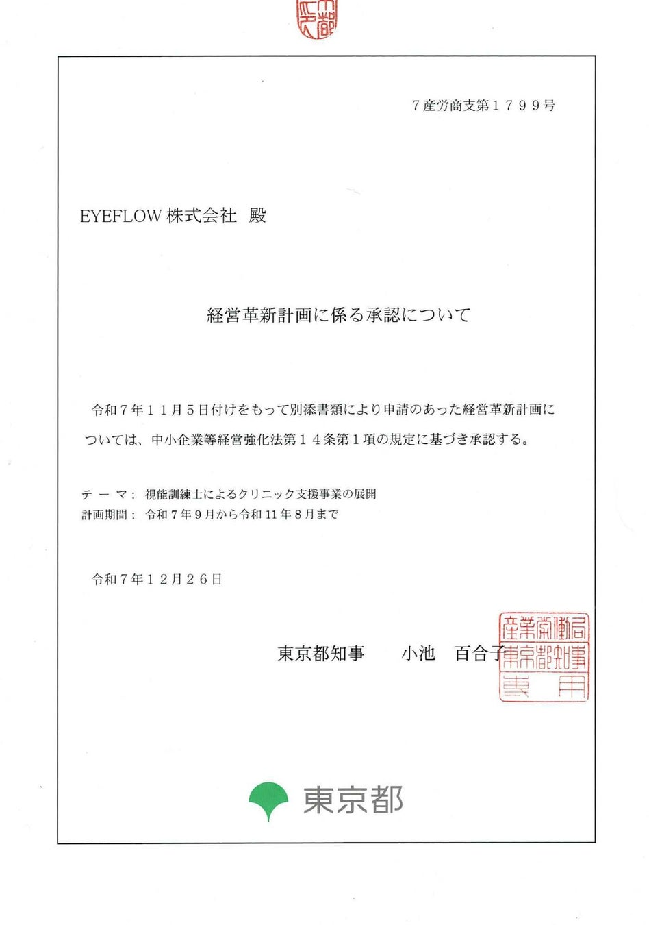 本サービスは、当社の経営革新計画が東京都に承認された計画に基づいて推進しています。