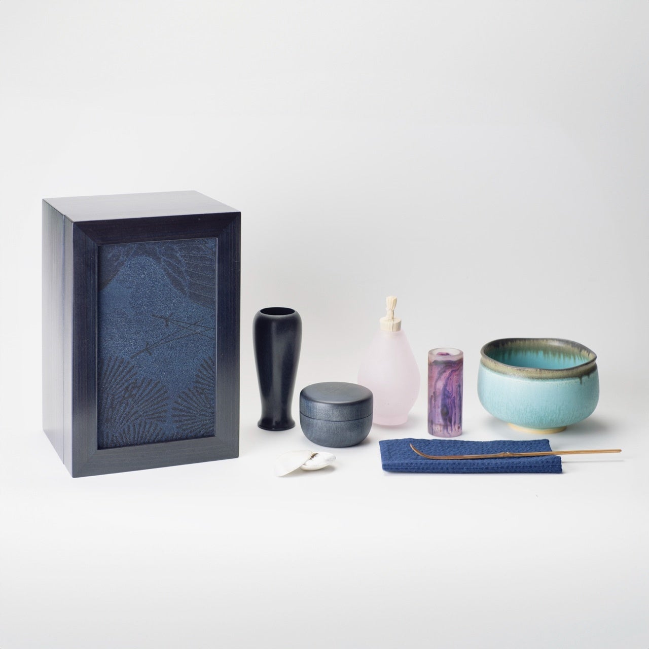 「茶宝箱」は、徳島杉に藍染を施した箱に茶道具一式を収めた茶道具セットです。すべて徳島の職人・作家による手仕事で、時間と手間を惜しまず一点一点丁寧に仕上げられています。