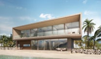 海沿いのロケーションに佇む住宅。外壁の外側にもう一枚の壁を設ける“ダブルスキン”という特徴的な外観とし、2層の壁間に庭とテラスを設けました。約170㎡のリビング・ダイニングは天井高約7.5mの伸びやかな空間で、大開口のサッシの先に海と緑が広がります。各室への動線をリビング・ダイニングに集約させることで、日常的な家族の交わりが自然に生まれるレイアウトとしています。