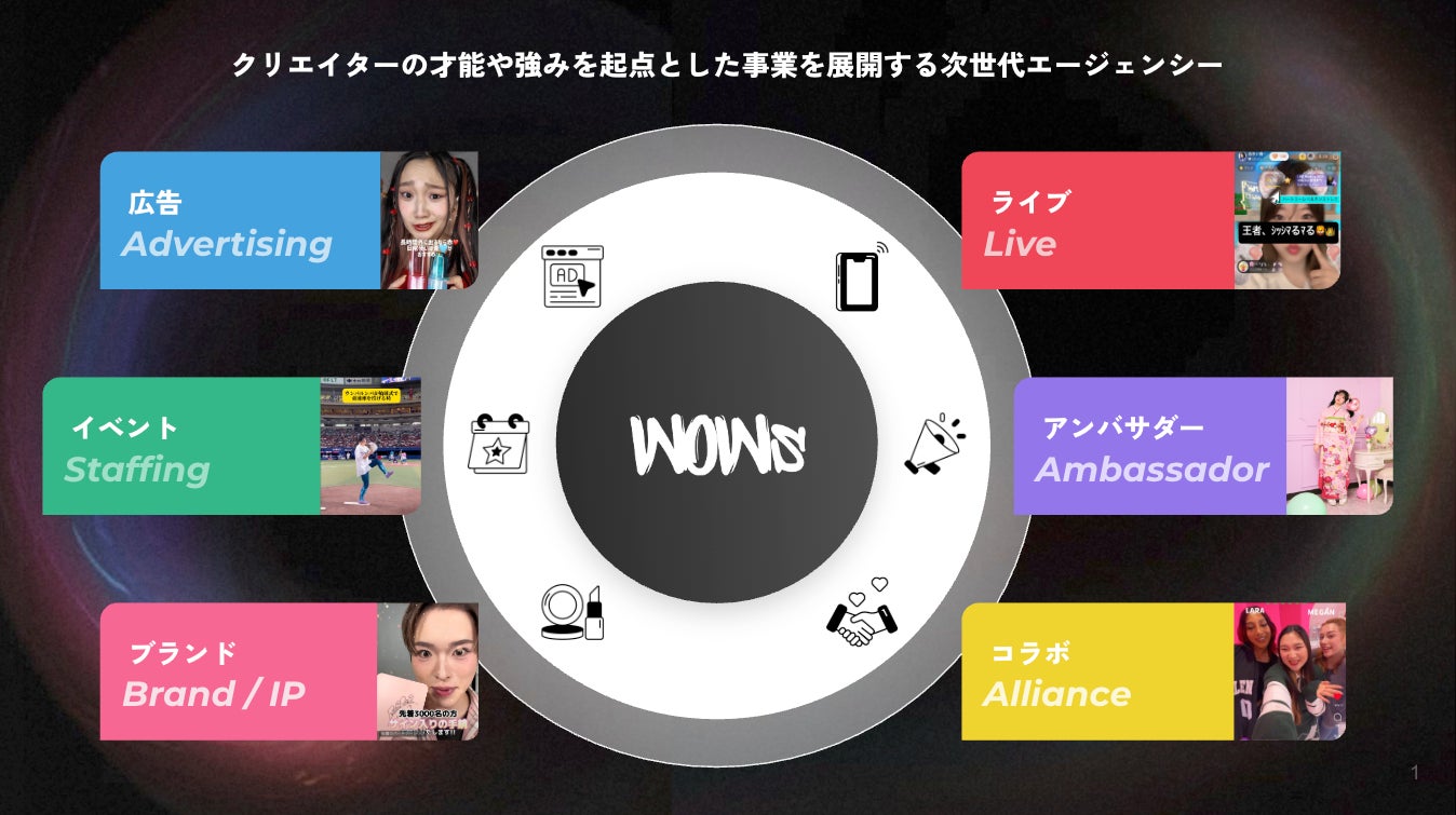 WOWsは、「クリエイターの夢を、市場の価値に。」をミッションに事業を展開するクリエイターエージェンシーです。所属する国内トップクラスのTikTokクリエイターを強みに、クライアント企業様のプロモーション支援からBtoC事業までクリエイタードリブンな事業展開を手掛けています。画一的な育成や管理をするのではなく、それぞれのカラーに向き合い、それぞれの夢に合った道を共創していくことを強みに、企画・ブランド・プロジェクト・事業化など多様な可能性を見据えながら、「夢中」を「市場価値」に変える挑戦を目指します。