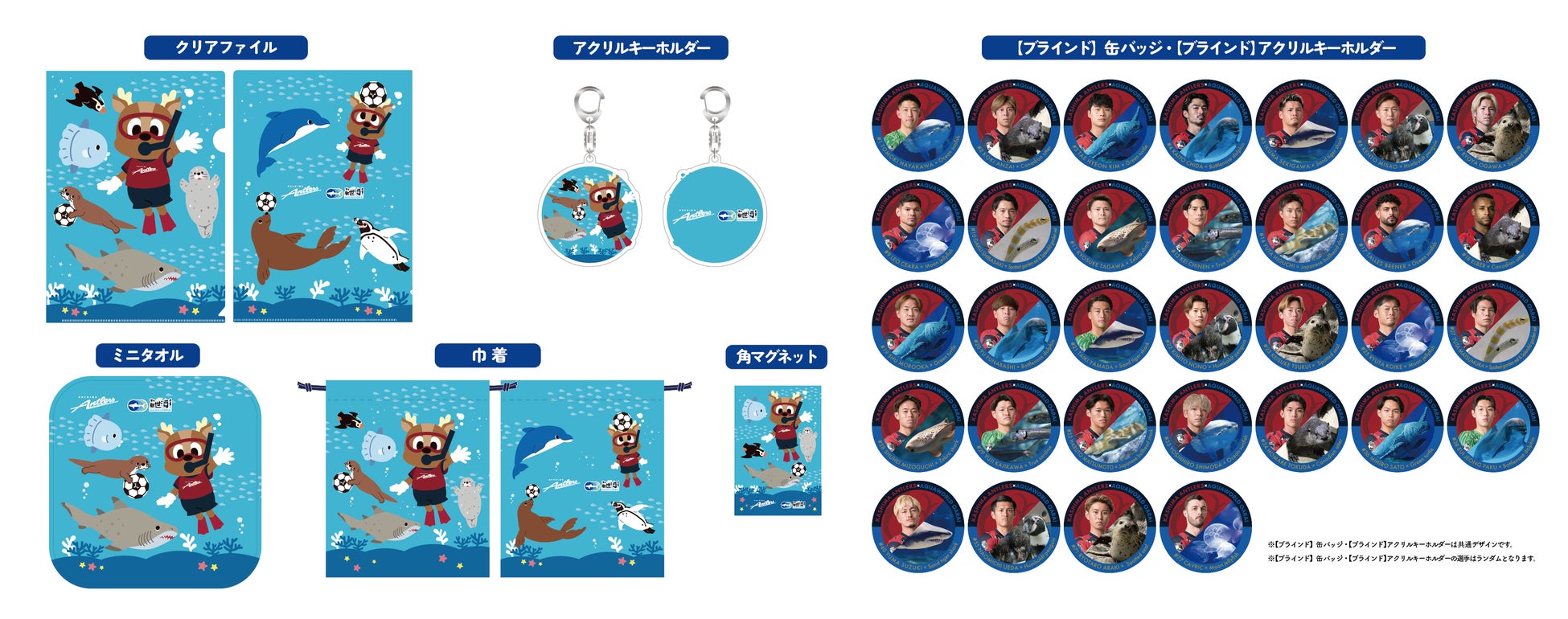 鹿島アントラーズの公式マスコットキャラクターであるアントンと、海の生きものたちのイラストが描かれたコラボグッズを販売します。また、鹿島アントラーズの選手と当館のサメやイルカ、アシカ、ペンギンたちなどがデザインされたブラインド缶バッジ・ブラインドアクリルキーホルダーもご用意しました。いずれも数量限定での販売となりますので、ぜひお早めにお買い求めください。