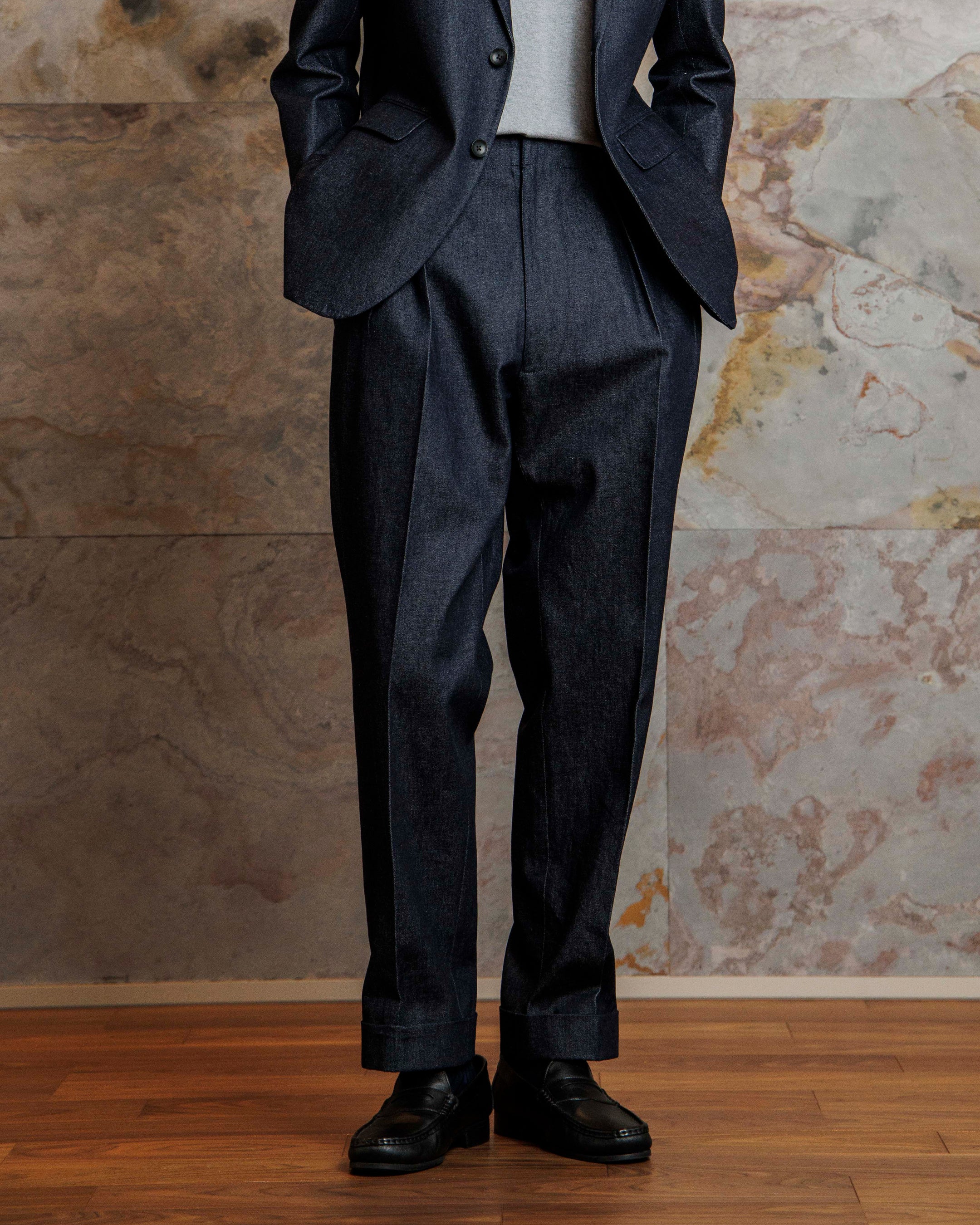 パンツは、シーンや好みに合わせて選べる2モデルを展開。「SUITIST DENIM TROUSERS」は、たっぷりとしたシルエットの2インプリーツとサイドアジャスター仕様で、タックインした際の美しいシルエットにこだわりました。また「SUITIST DENIM CARROT」は、キャロットパンツというトレンド感のあるウエストシャーリングのスタイルを選定。ややドレスダウンした印象を与えることが出来る深いプリーツが特徴で、横から見た時に美しいシルエットが出る点がポイントです。
