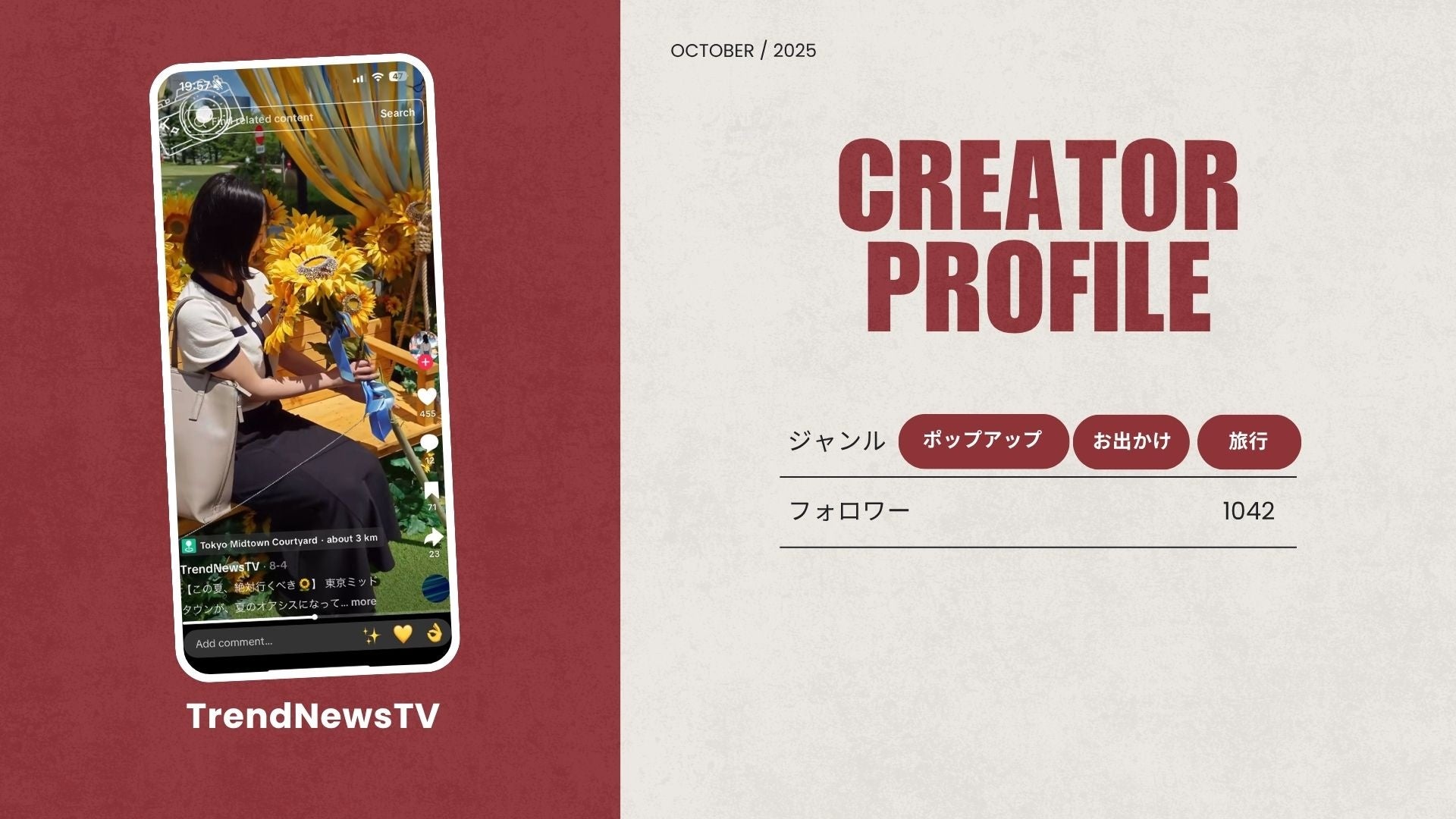 「TrendNewsTV」は、企業やブランドのポップアップイベントをはじめ、話題のホテルなどを中心に取材し、動画を制作・発信しています。これまでの投稿の中には、再生回数3万回を超える動画も。ポップアップ・おでかけ・旅行分野に強みを持つ同メディアの加盟により、SNS上でのイベント認知や集客の効果がさらに期待できます。