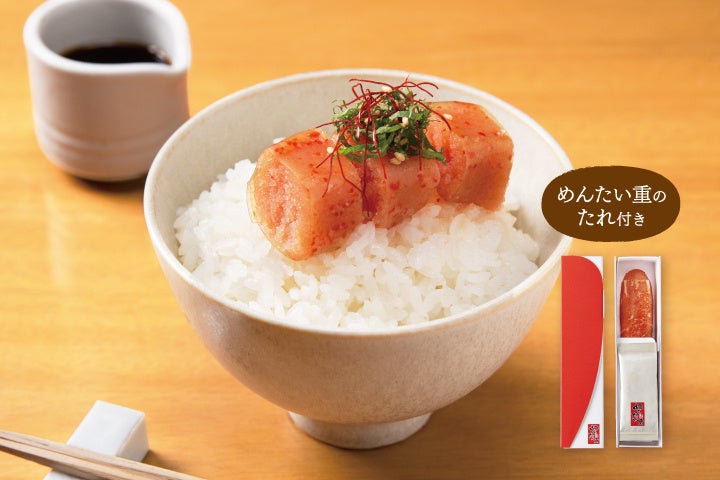 「元祖博多めんたい重」発祥の味をご家庭で。一つひとつ手作業で丁寧に昆布を巻いた明太子と、明太子の旨みを凝縮した「めんたい重のたれ」がセットになった、当店自慢の逸品です。