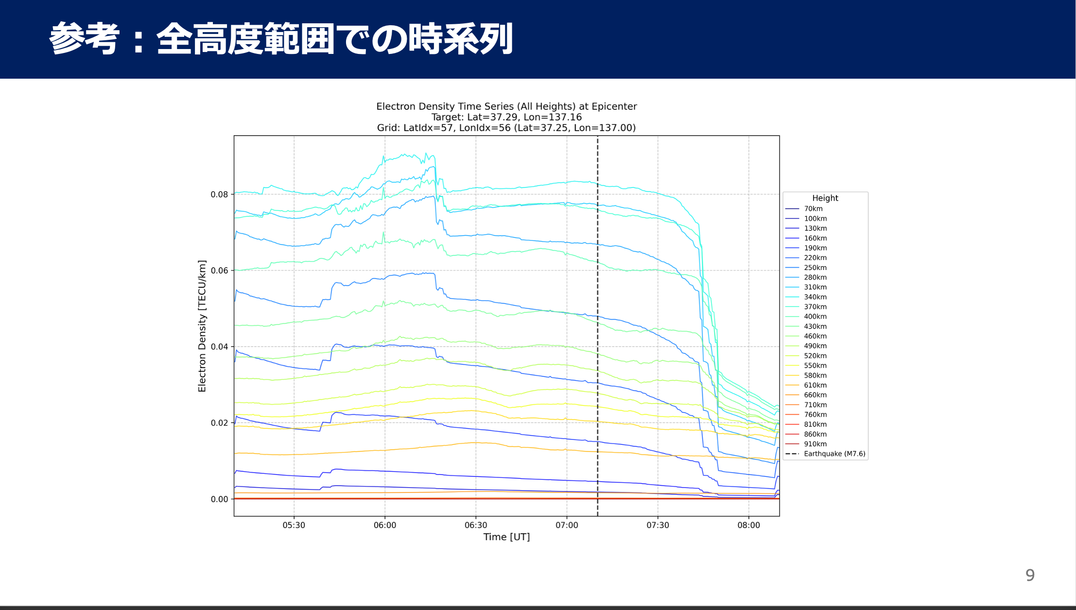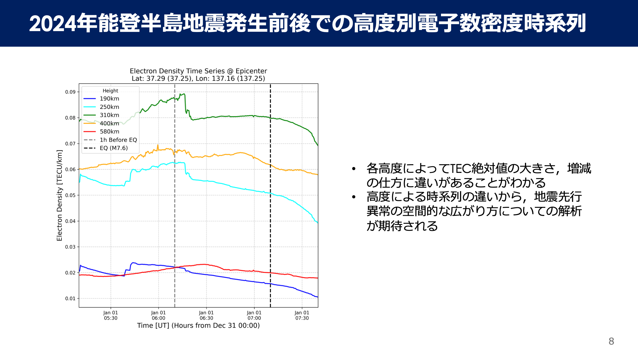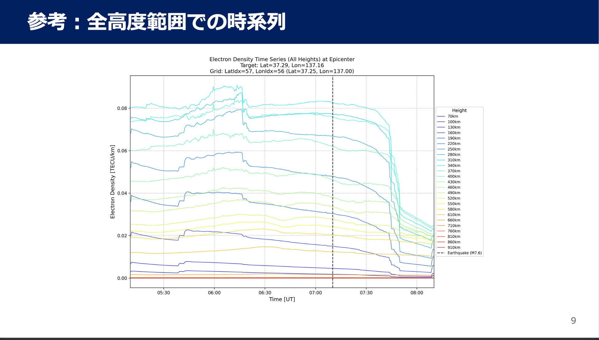 京都大学大学院情報学研究科の梅野健教授と、京都大学工学部4回生の山本信吾氏が中心となるグループ(物理統計学分野)は、ちょうど2年前の元旦に発生した能登半島地震について、同研究科で開発された高速高精細3次元電離圏トモグラフィー技術(FCIT)を用いて、地震前後のデータに基づいて高度別の電子数密度の時間変化を調査しました。その結果、高度310km付近の電子数密度が地震発生直前の14時40分から15時15分(地震発生の約1時間半前から55分前)に異常な増加を示し、その後急激に減少する現象を特定し、この結果は2025年12月20日に開催された日本地震予知学会学術講演会にて発表されました。