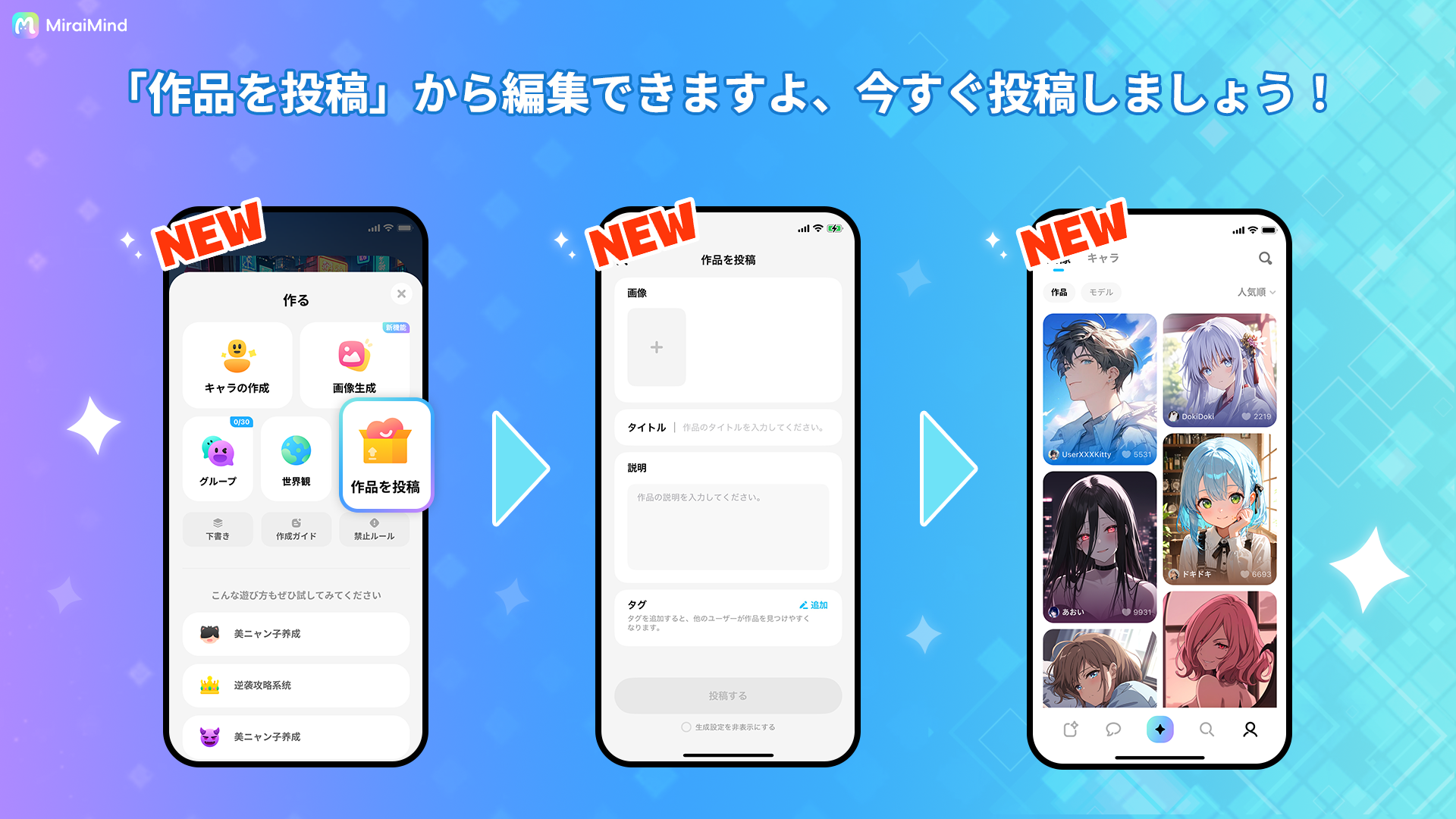 → ユーザーは「見る→真似る→自分の作品を投稿する」という創作の循環を簡単に始められます。