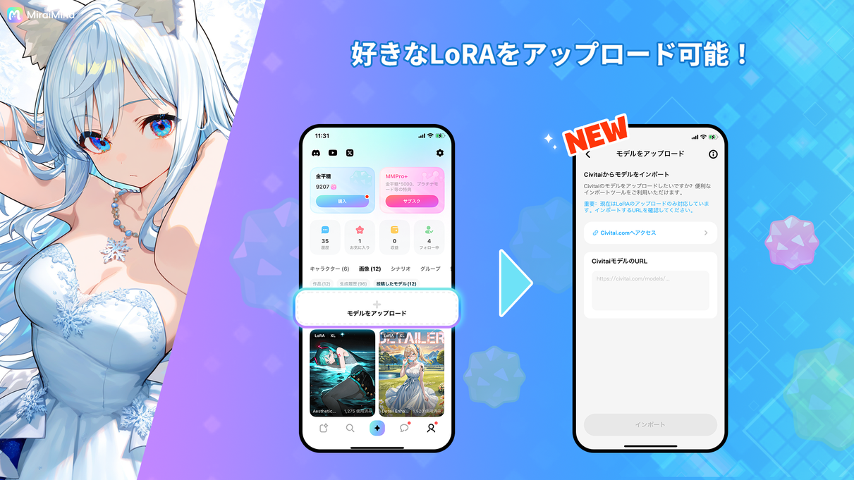 マイページの【画像】→【投稿したモデル】→【+】からLoRAをアップロード可能(現時点ではcivitai.com のLoRAに対応)。自分のスタイルをコミュニティに反映させ、フォロワーや反応を得られます。