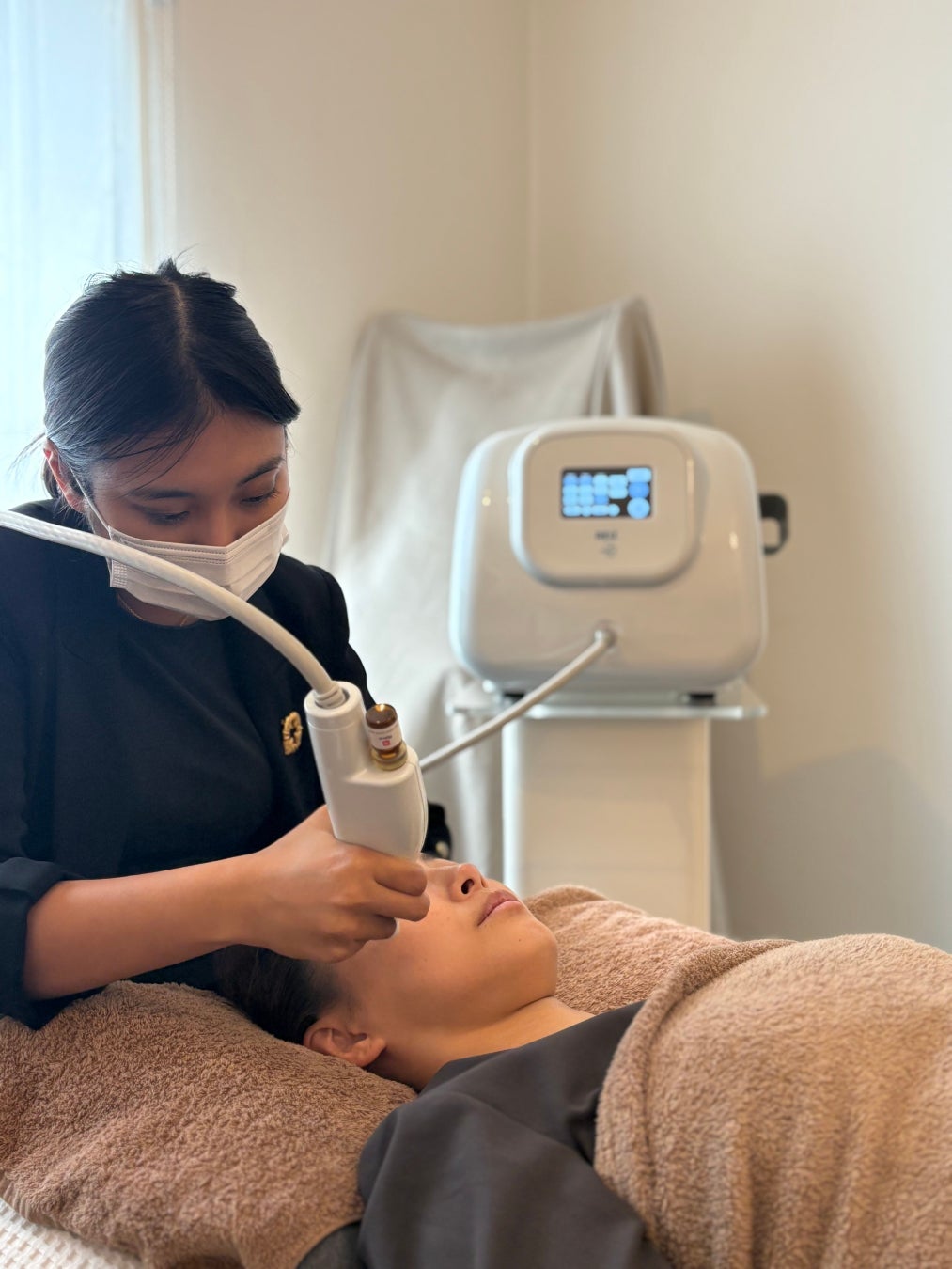 針を使わない技法とお聞きし、痛みがあるのかないのかという不安はありましたが、本当に顔に美容液を噴霧していくだけなので痛みは全くなく、びっくりしました。顔周りも当てて下さるので、刺激によって全体的に引き上がる感触と、肌もしっとりとしていく感覚がありました。舞台やレッスンで忙しい日々の中でも、こうした手軽なケアができるのは嬉しいですね。