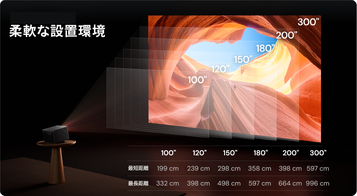 0.9–1.5:1の光学・デジタルズームと±105%の垂直レンズシフトにより、40〜300インチまで自由に投影可能。狭い部屋でも、屋外でも、どんな空間でも歪みのない美しい映像が得られます。
