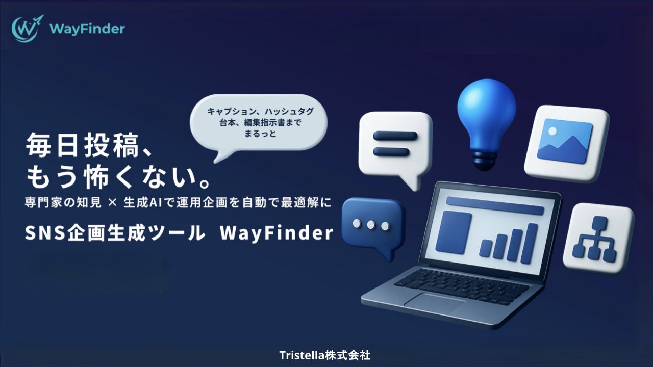 Tristella株式会社(本社:東京都渋谷区、代表取締役:中山顕作)は、SNS運用代行会社・事業会社向けに提供するSNS企画生成AIツール「WayFinder(ウェイファインダー)」において、各業界のトップマーケターや専門企業と連携し、その知見をAIロジックに反映させる「WayFinder 公式パートナーシッププログラム」を開始いたしました。