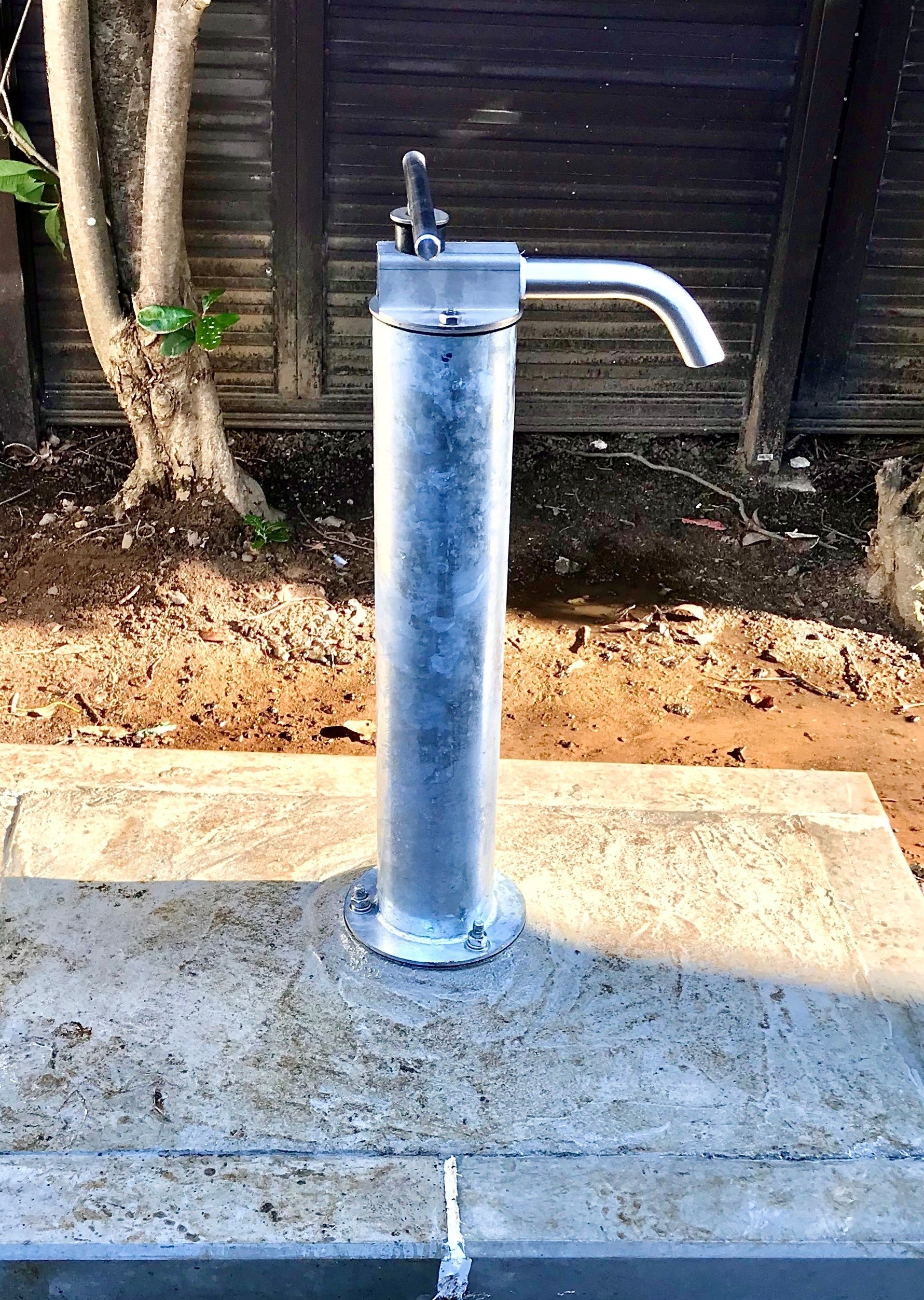 過酷な自然環境下で長年使用されてきた、仏・Vergnet Hydro社製の深井戸用人力ポンプ。安全性・操作性・耐久性・デザイン性を兼ね備え、2025年品川区内小学校に防災井戸として設置しました。