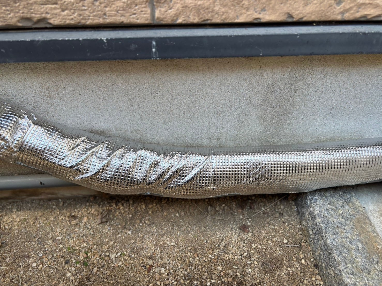 今回ご紹介する方法では気泡緩衝材(プチプチ)とアルミ保温シートの二重構造となっていますが、隙間から冷気が入り込むことがありますので、配管に沿って隙間がないよう強めに巻き付けていくことがポイントです。