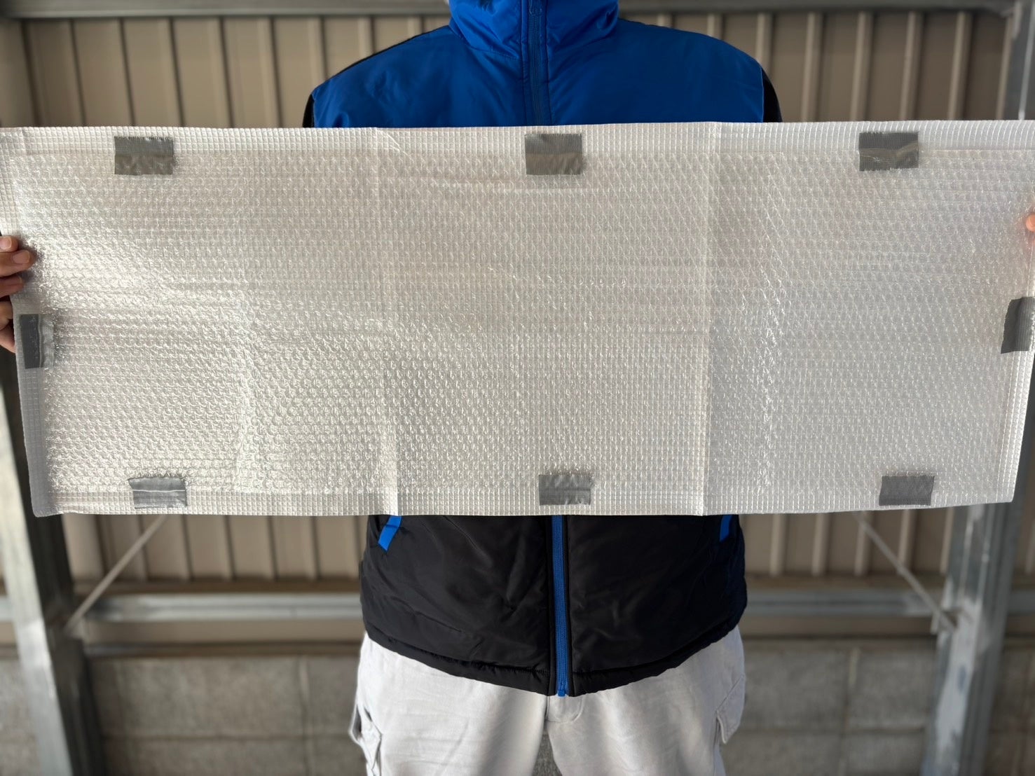 3.気泡緩衝材(プチプチ)とアルミ保温シートを粘着テープで固定する