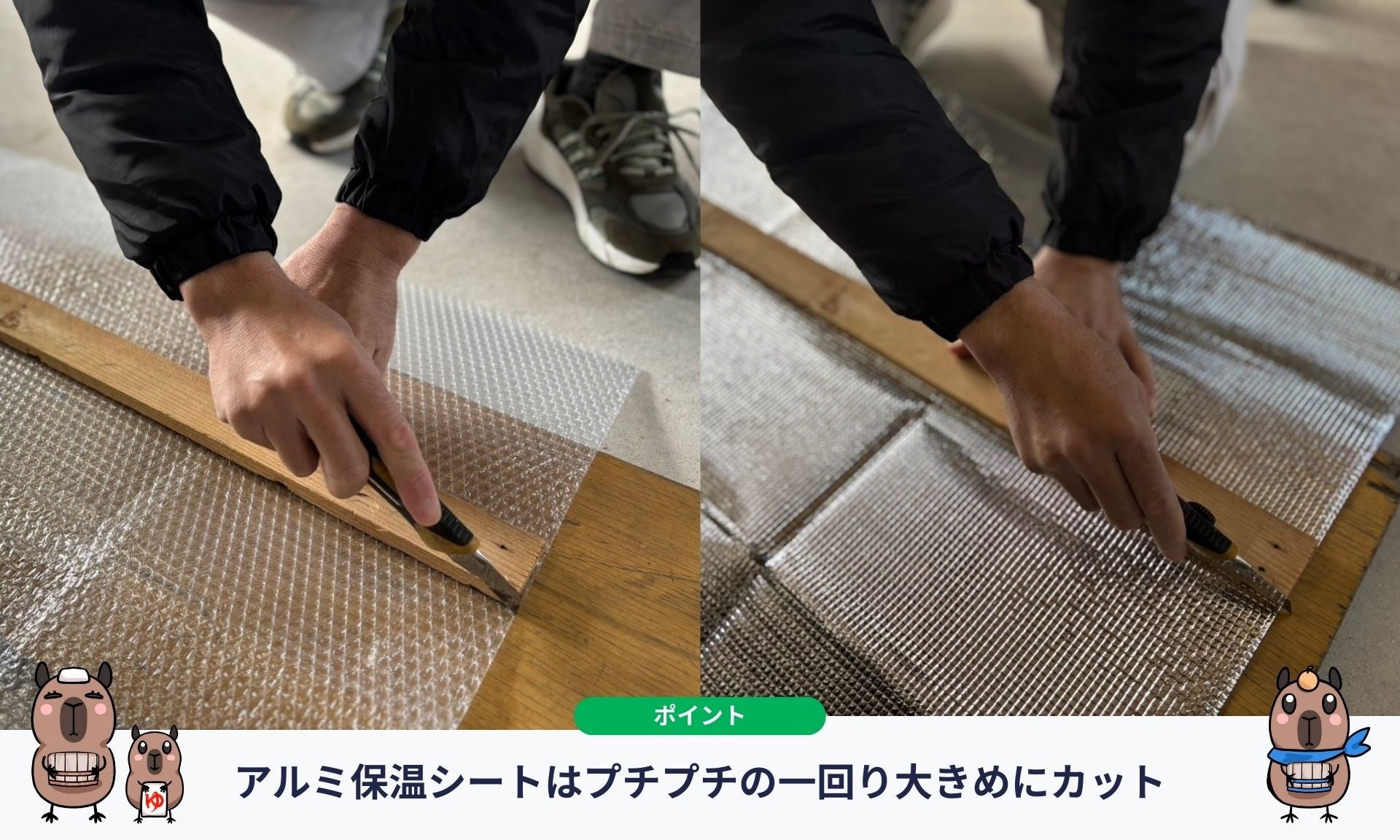 次に気泡緩衝材(プチプチ)とアルミ保温シートをカットしていきます。