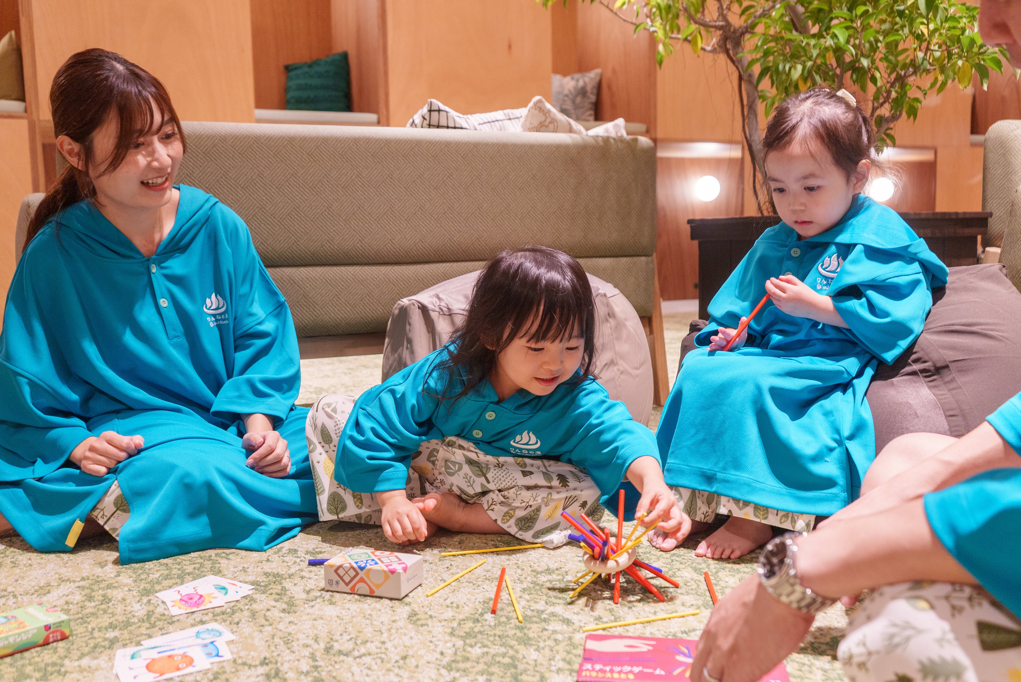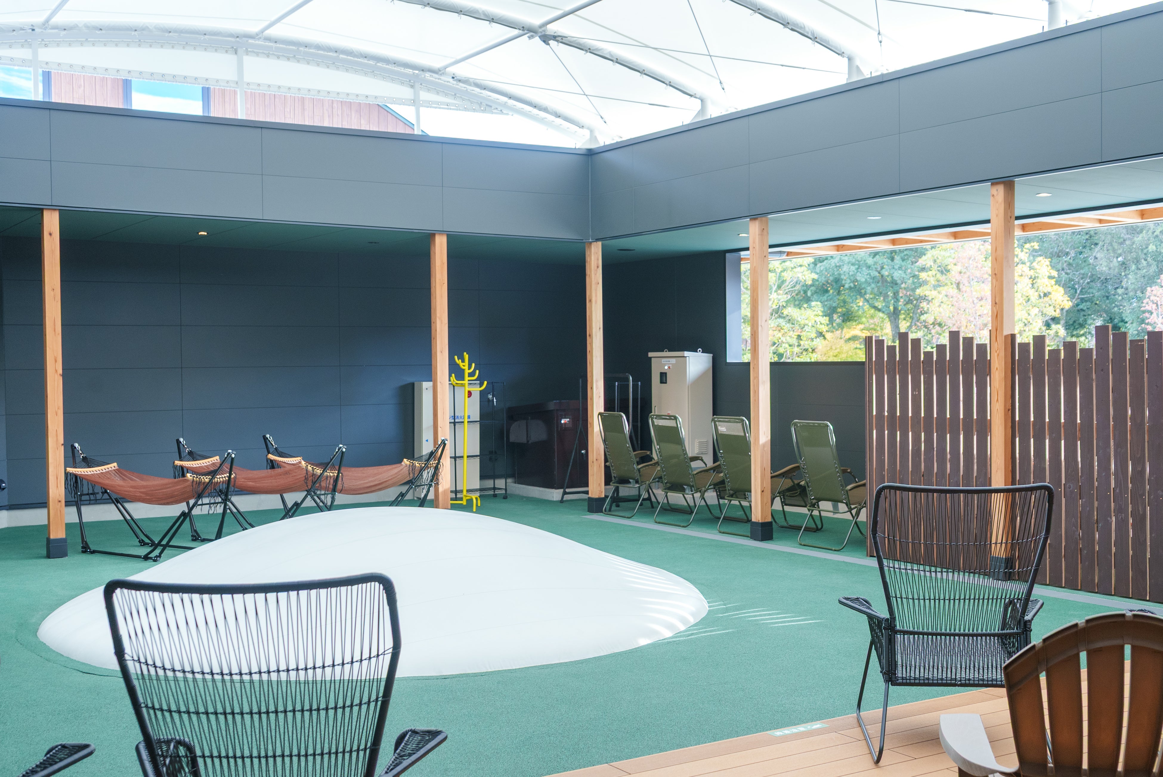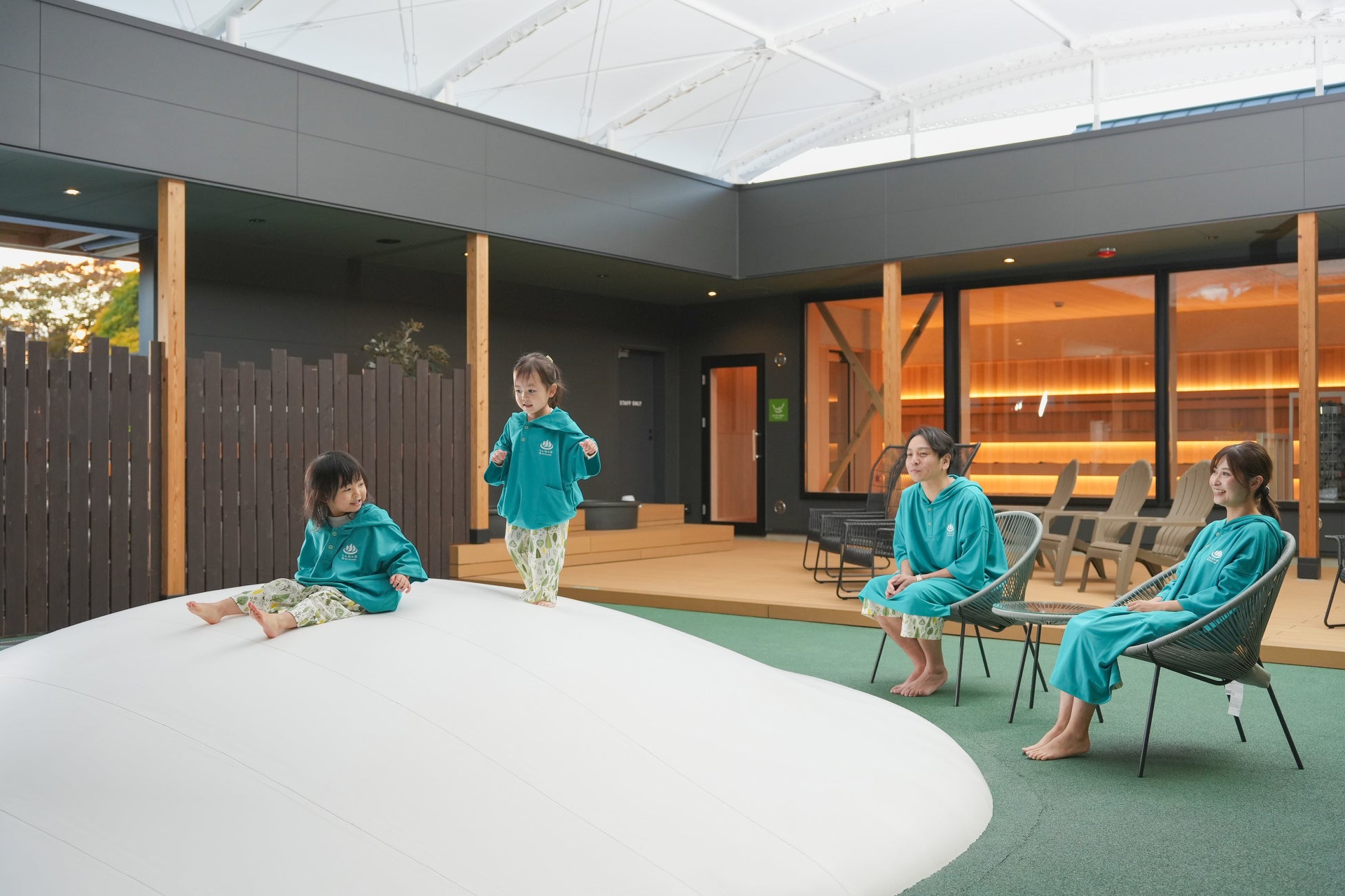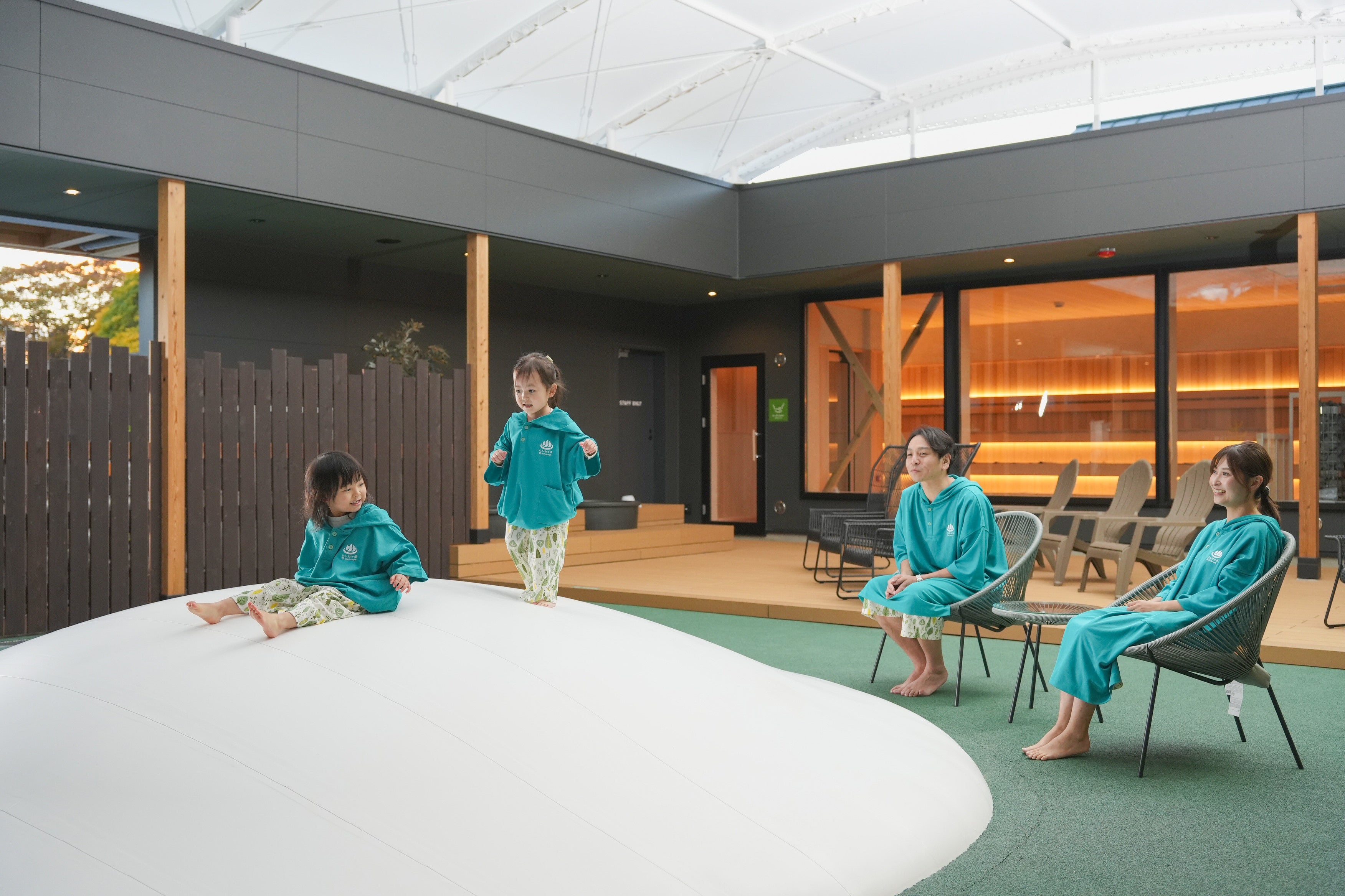 男女共用のサウナを有した中庭空間です。館内着で楽しめる大型サウナ室にはフィンランドHARVIA社製のサウナストーブを設置。毎日、熱波パフォーマンスやアウフグースを開催します。また、ガーデンの中央にはトランポリンのように飛び跳ねる「ふわふわドーム」を用意し、お子さんが楽しんでいる姿を、サウナから見守ることができます。