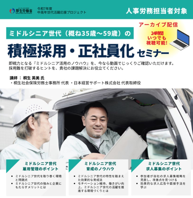 労働力不足が深刻な社会課題となる中、豊富な経験とスキルを持つミドルシニア世代の活用は、企業にとって不可欠な経営戦略の一つとなっています。本セミナーでは、中高年世代の採用・正社員化を促進するため、現場ですぐに活用できる実務的なノウハウを体系的に提供します。オンラインでのアーカイブ配信により、多忙な人事労務担当者が時間や場所を問わず視聴できる環境を整えました。