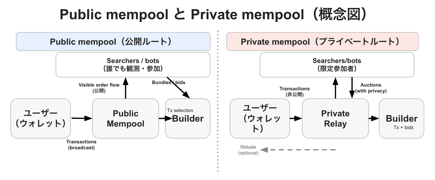 問題は、このプライベートルートを利用する業者(ブロック構築者)が、他の市場参加者よりも有利な条件で取引を執行できる可能性があることです。
