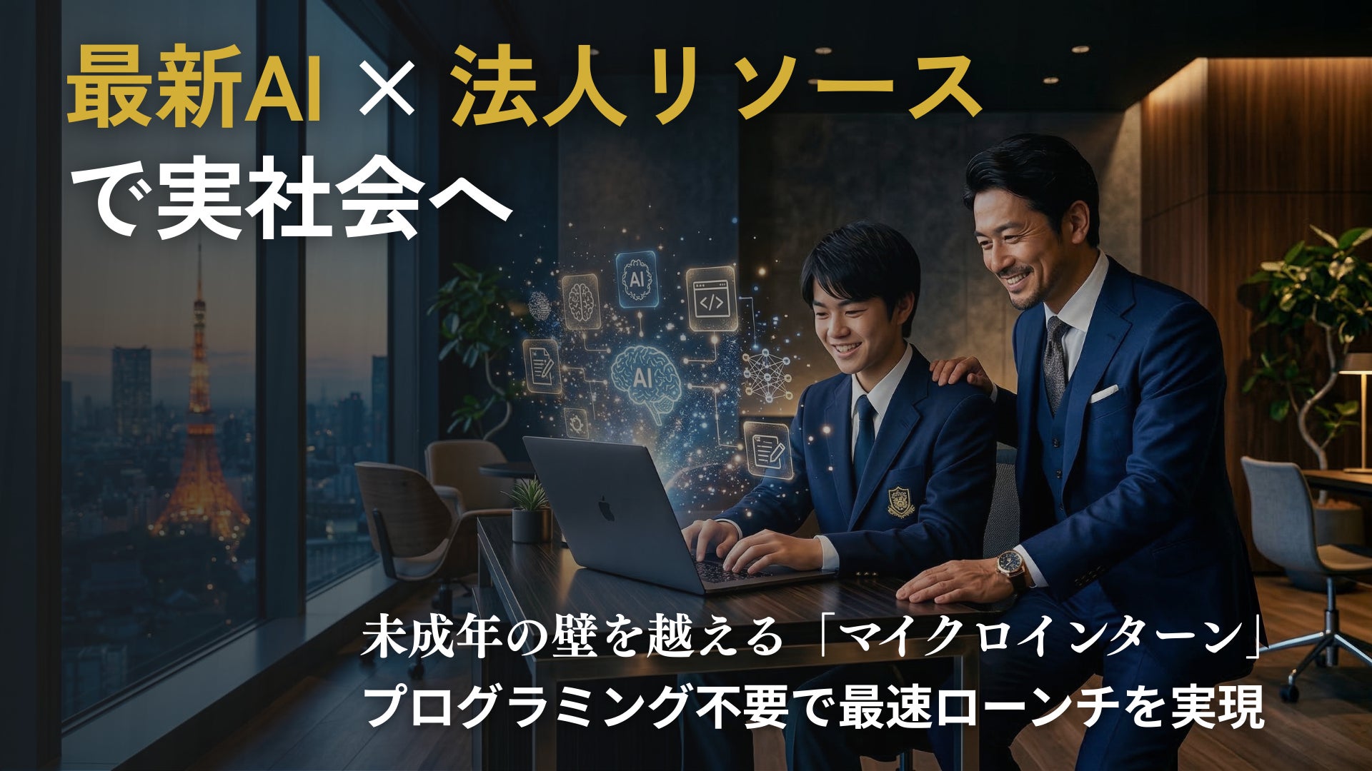 高校生が個人で活動しようとしても、契約や決済など「大人の事情」で必ず壁にぶつかります。基礎プログラムを経て一定レベルに達した学生を弊社の「マイクロインターン」として迎え入れ、法人格をバックアップとして使い、実際のプロダクトローンチや企業間提携を伴う「本物のビジネス」を動かす経験を積ませます。