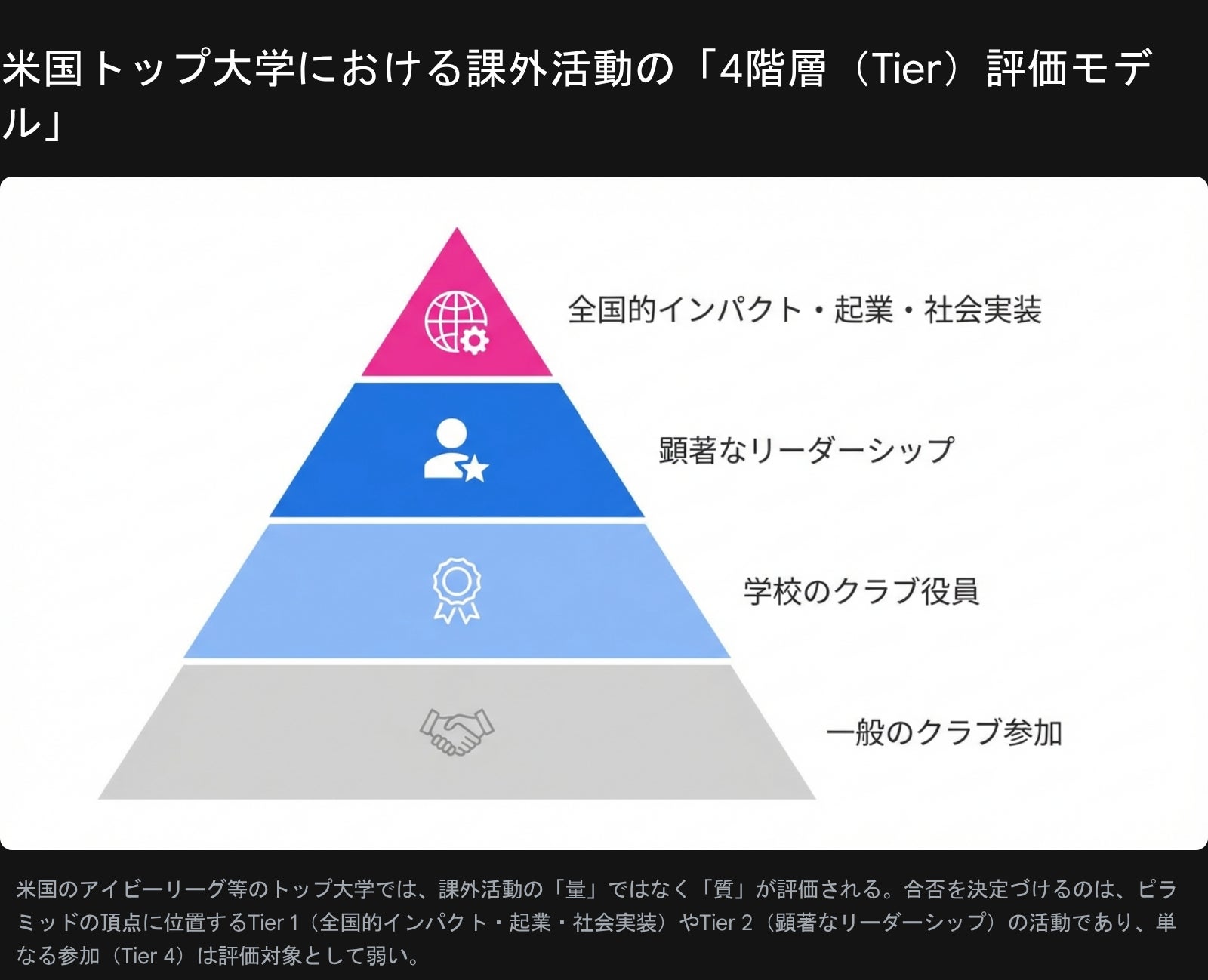 🇺🇸 アメリカ(Tierシステム):ハーバード等のトップ大学では、課外活動を4階層に分類。単なる部活やボランティア(Tier 4)は評価されず、合格の鍵を握るのは「起業や全国規模のプロジェクトや社会実装ビジネス(Tier 1)」という突出した実績です。