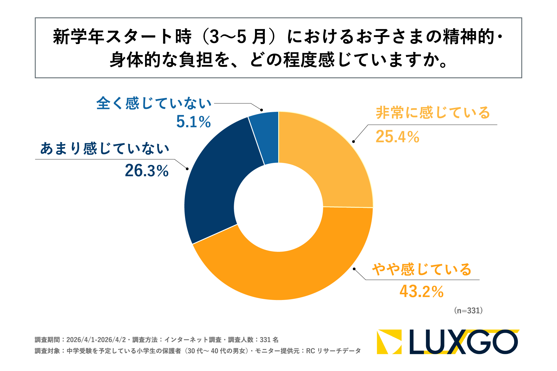 中学受験を予定している小学生の保護者の6割以上が、新学年スタート時に子どものメンタル不調のサインを感じることがあると回答!LUXGO株式会社が「中学受験家庭の新学年ストレスに関する調査」を実施!