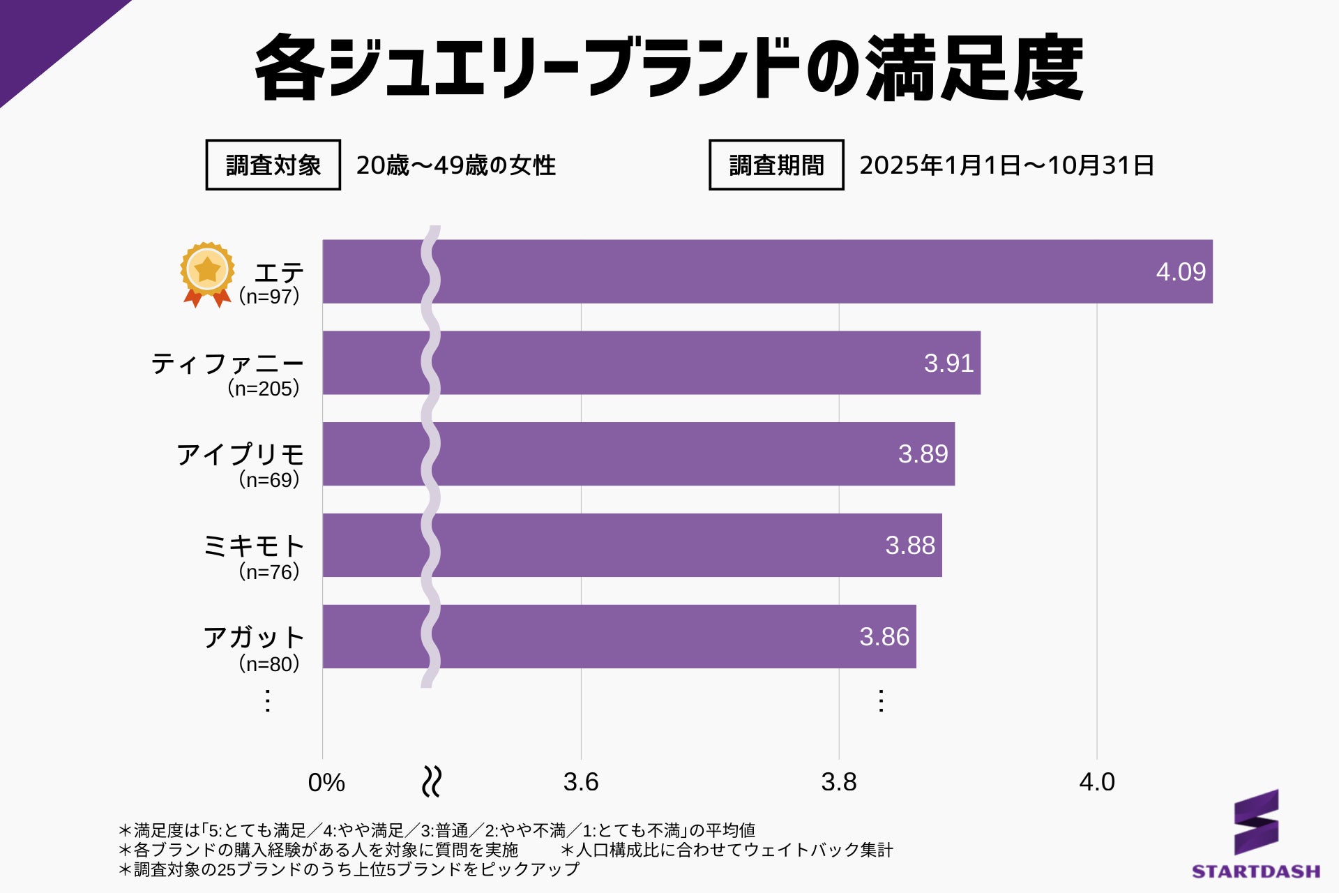 満足度が最も高かったのは『エテ(ete)』で4.09でした。これに『ティファニー』が3.91、『アイプリモ(I-PRIMO)』が3.89、『ミキモト』が3.88、『アガット(agete)』が3.86と続きました。