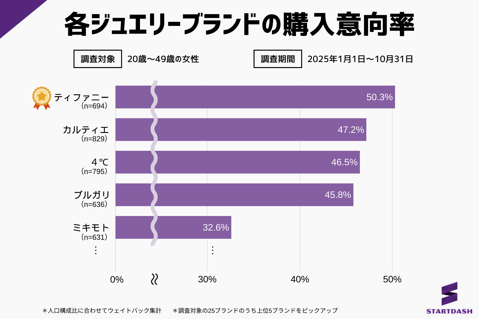 結果を見ると、『ティファニー』が50.3%で最も高い数値となり、唯一過半数を超えました。『カルティエ』(47.2%)、『4℃』(46.5%)、『ブルガリ』(45.8%)がそれに続き、5位には『ミキモト』が32.6%で位置しています。