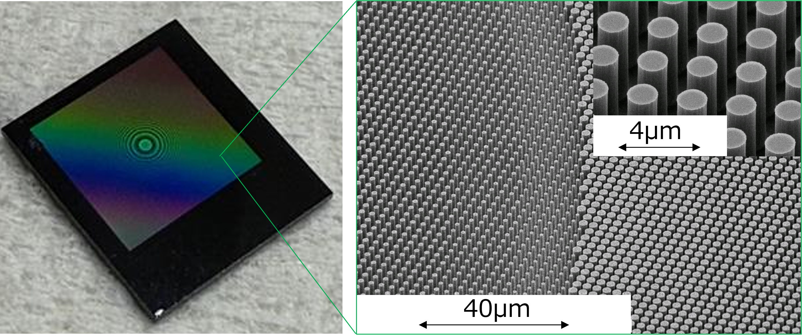 メタレンズは、光学素子表面に形成された波長サイズ以下の微細構造(メタアトム)によって光を制御する平面型レンズです。