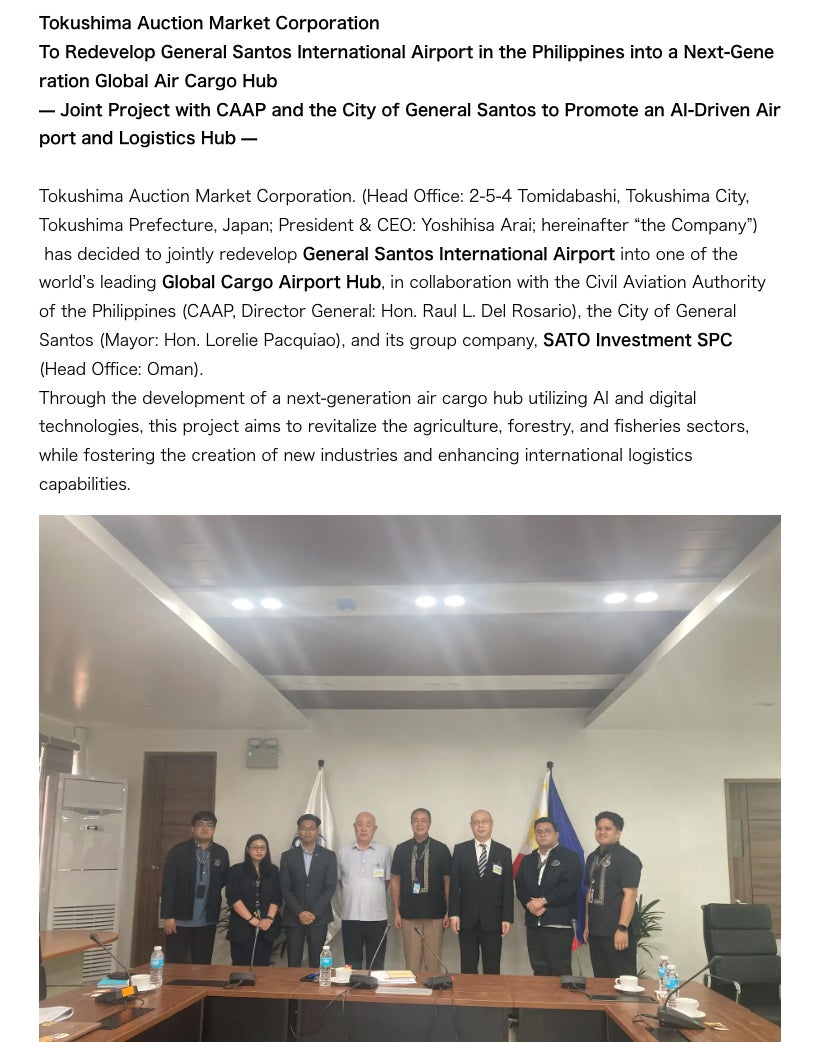 Tokushima Auction Market Corporation (Head Office: 4-1-38 Kitaokinosu, Tokushima City, Tokushima 770-0872, Japan (c/o Tokushima City Central Wholesale Market); CEO & President: Yoshihisa Arai) hereby announces that its group company, Sato Investment SPC (Head Office: Sultanate of Oman), has entered into a strategic partnership agreement with a Philippine meat production group (New Canaan Energy Resources Corporation Headquarters: Philippines, and Olivianox Ventures Corporation Headquarters: Philippines) to commence full-scale operations in the integrated production of beef (Wagyu-equivalent quality), chicken, pork, mutton, and lamb.