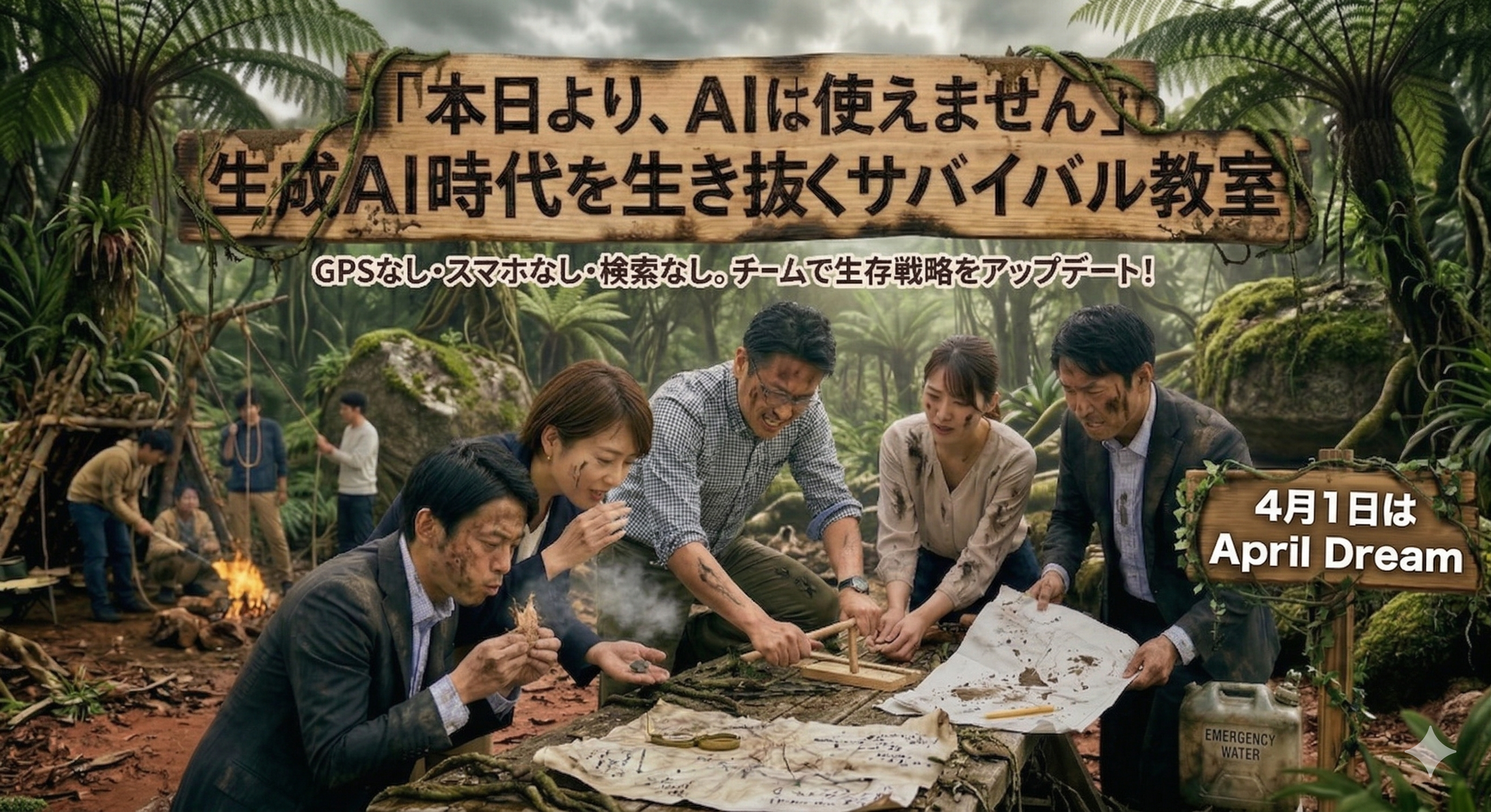 Claude導入支援やAI研修をリードする株式会社Advanced AI Partners(本社:東京都港区、代表取締役:麹池貴彦、以下AAIP)は、4月1日、「アナログの極致」へと立ち返る『生成AI時代を生き抜くサバイバル教室』の開催を発表します。AIを最も推進してきた私たちが、AIを一切禁じた環境で「人間の根っこ」を試す、真剣なチームビルディング・エンターテインメントです。 5 月、関東近郊の広大な屋外エリアを舞台に、企業の生存戦略が塗り替えられます。