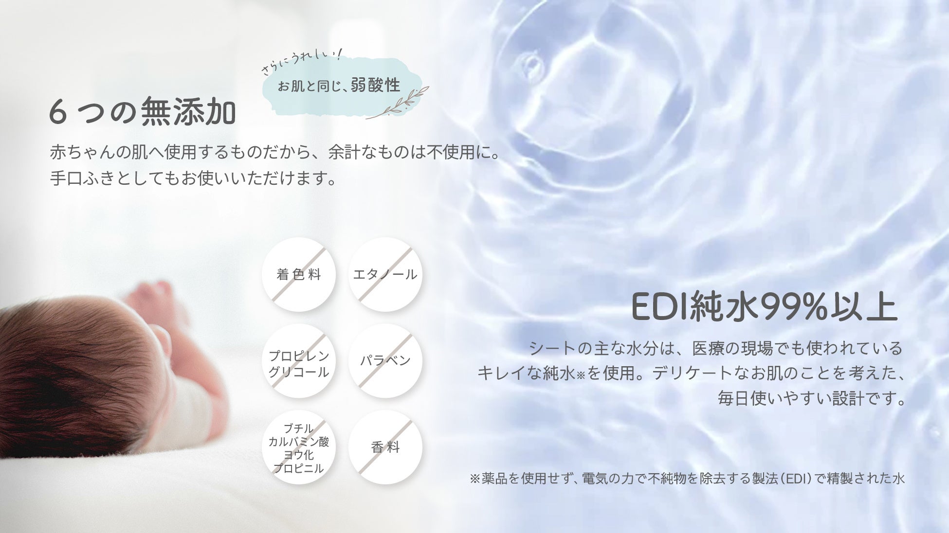 さらに、デリケートな赤ちゃんの肌に配慮し、アルコール、パラベン、香料、着色料、PG、IPBCを使用しない 【6つの無添加処方】を実現しました。