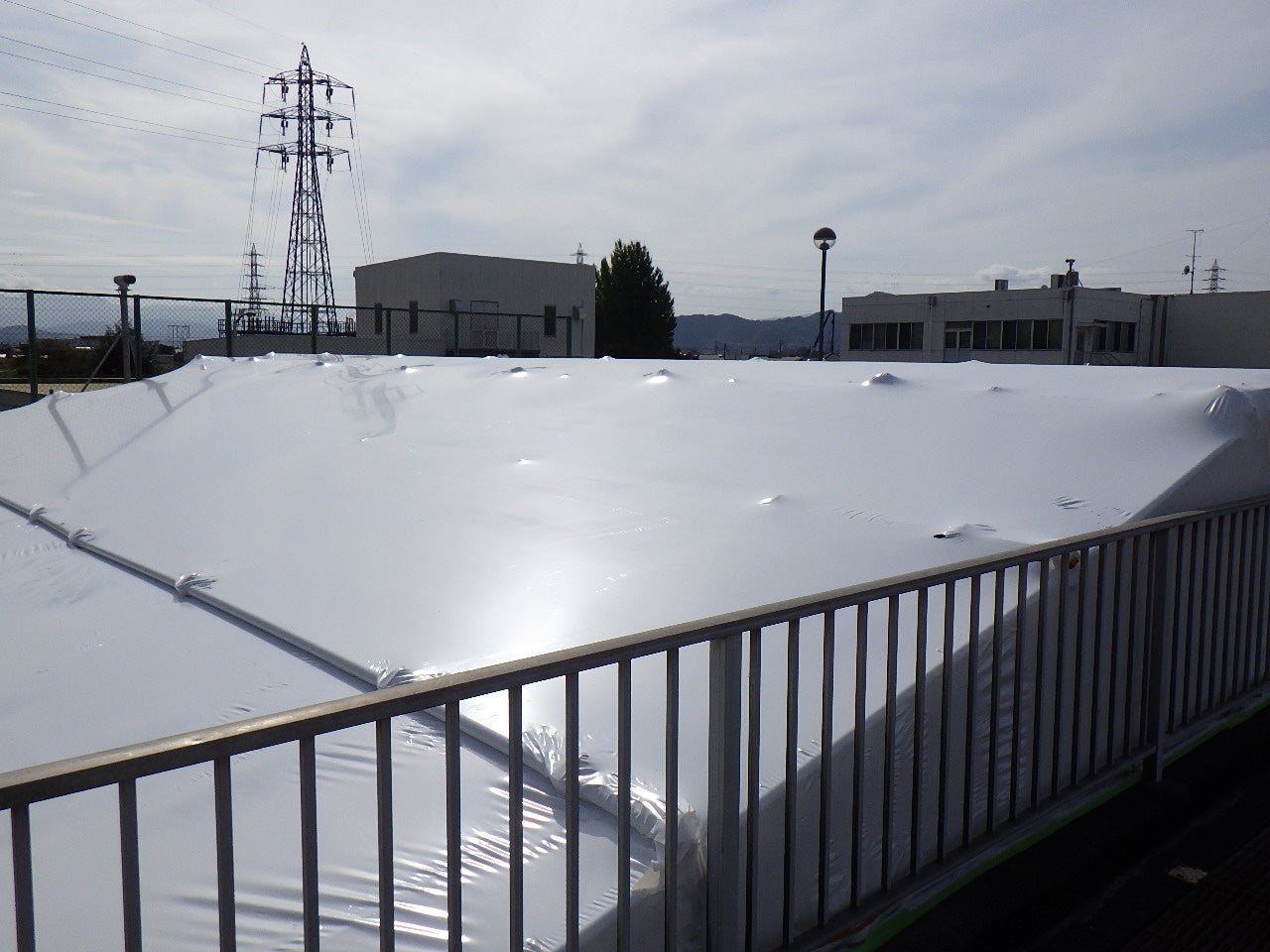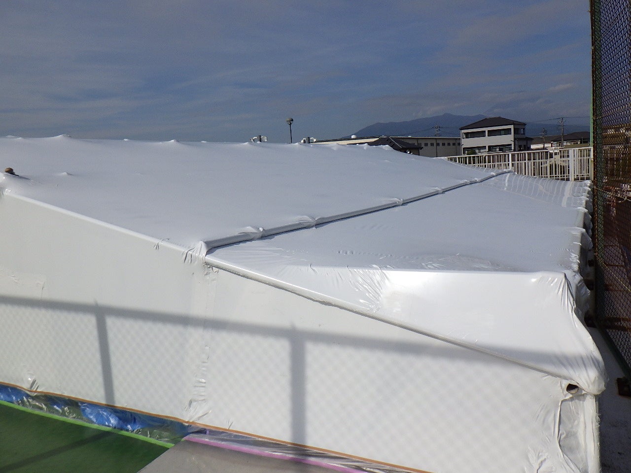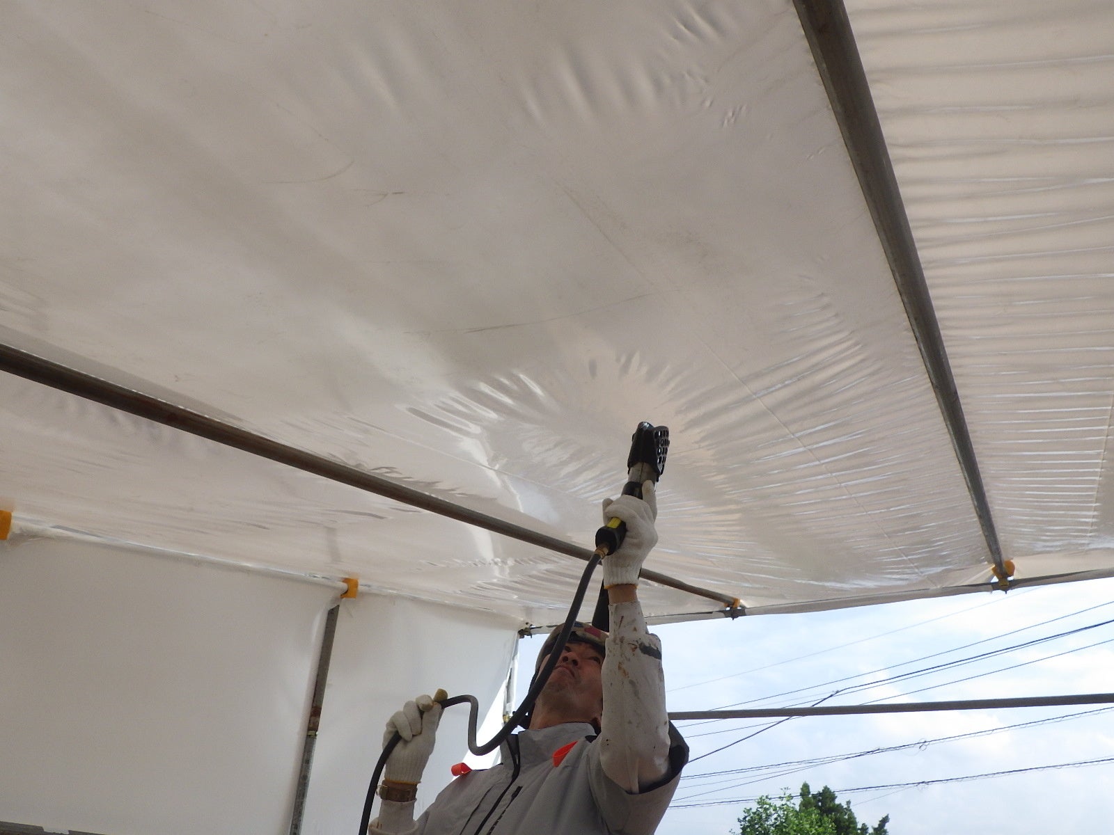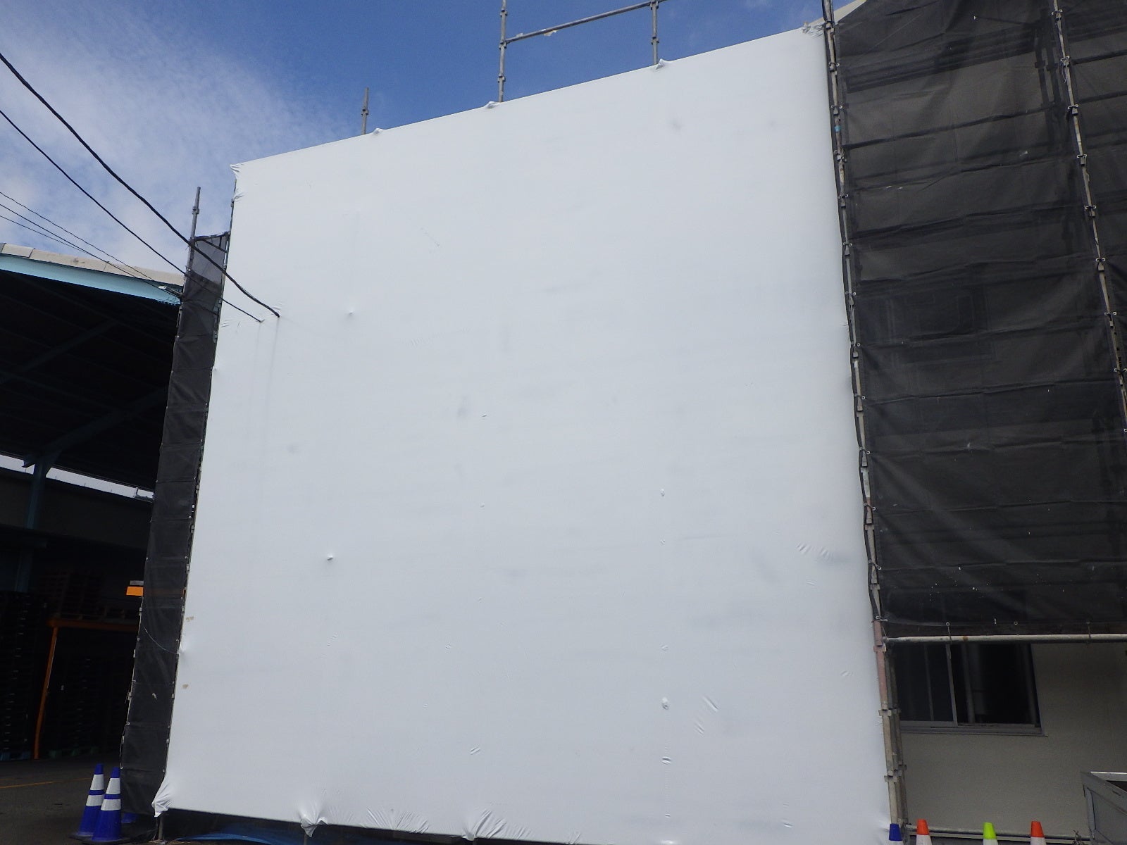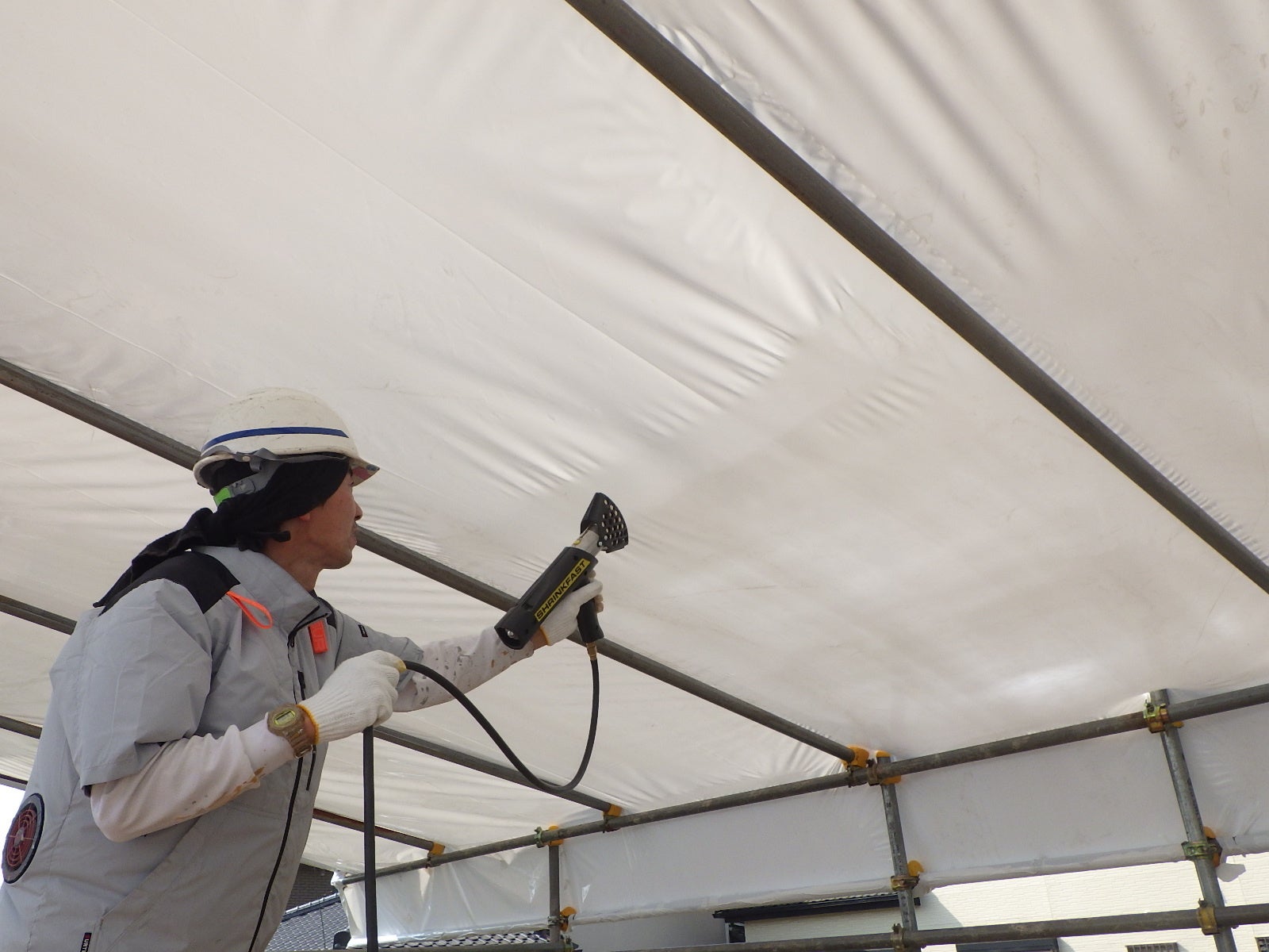 その答えが、ラップ・シールディング工法です。 専用のシュリンクフィルムを熱で収縮させ、対象物を「包んで密封する」養生技術。板で「囲う」のではなく、フィルムで 「包む」。