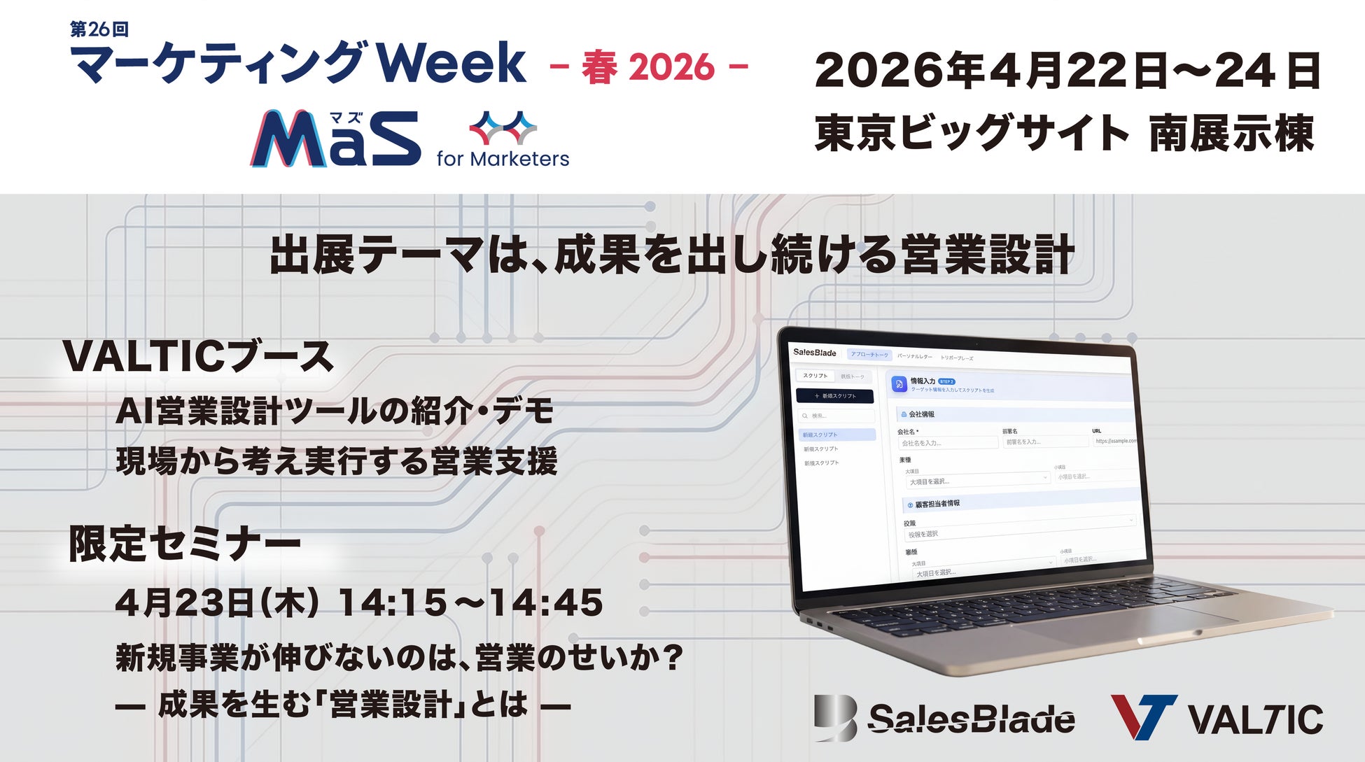 VALTICブースでは、実行支援型AI営業設計ツール「SalesBlade(セールスブレイド)」のデモ体験や、現場から成果をつくるVALTIC独自の営業設計支援サービス(BPO事業)を紹介。また、会期中には「新規事業が成果を生むための営業設計」をテーマにしたセミナーを開催いたします。