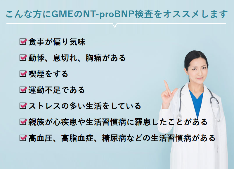株式会社GME(所在地:群馬県高崎市)は、郵送で完結する「NT-proBNP検査」を提供しています。本検査は、血液中のNT-proBNPを測定し、心臓にかかる負担のサインを把握するためのスクリーニング(気づき)として活用される指標です。