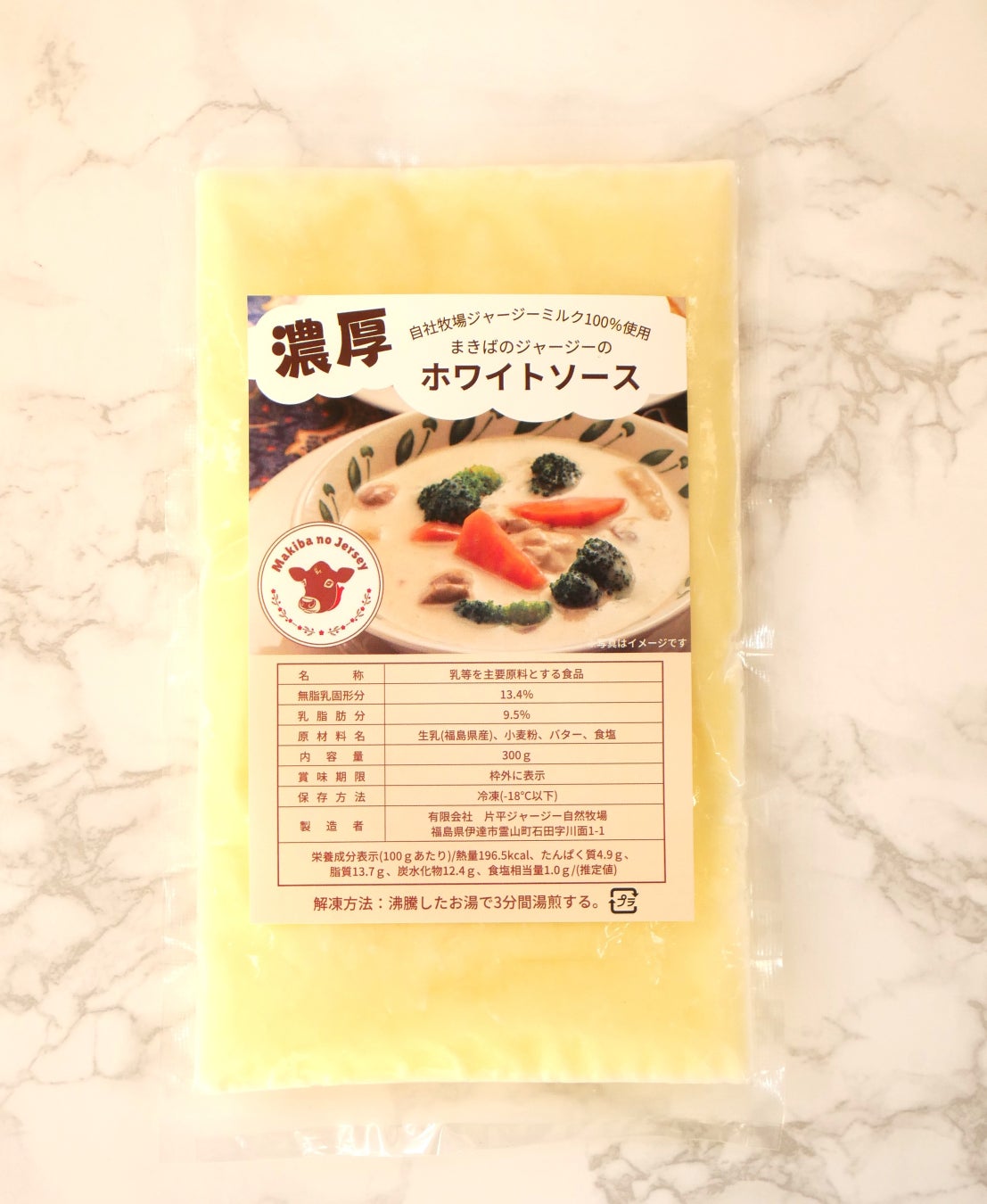 原材料は、生乳(福島県産)、小麦粉、バター、食塩のみ。無脂乳固形分13.4%、乳脂肪分9.5%のジャージーミルクならではのコクと、料理の味を引き立てるやさしい後味が特長です。内容量300g、冷凍(-18℃以下)保存。沸騰したお湯で約3分の湯せんで使用可能です。グラタン、ドリア、シチュー、パスタなど幅広いメニューに対応し、家庭用はもちろん、レストランやホテルのメニューでも活用しやすい設計です。栄養成分(100gあたり)は、熱量196.5kcal、たんぱく質4.9g、脂質13.7g、炭水化物12.4g、食塩相当量1.0g(推定値)です。