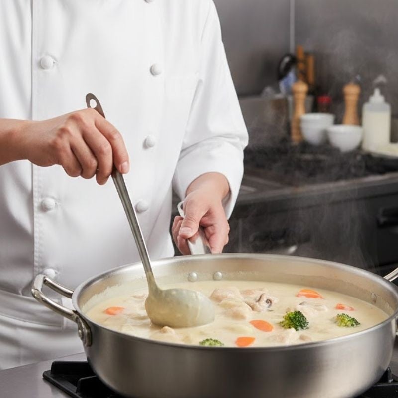 今回のホワイトソースは、“ジャージーミルクの濃厚さを活かしつつ、家庭でもレストランやホテルでも使いやすい仕上がりにする” という開発方針のもと、萩シェフの技術的アドバイスを受けてレシピが完成しました。※本商品の再販・販売活動には関与しておらず、レシピ開発時の監修のみでの参加となります。