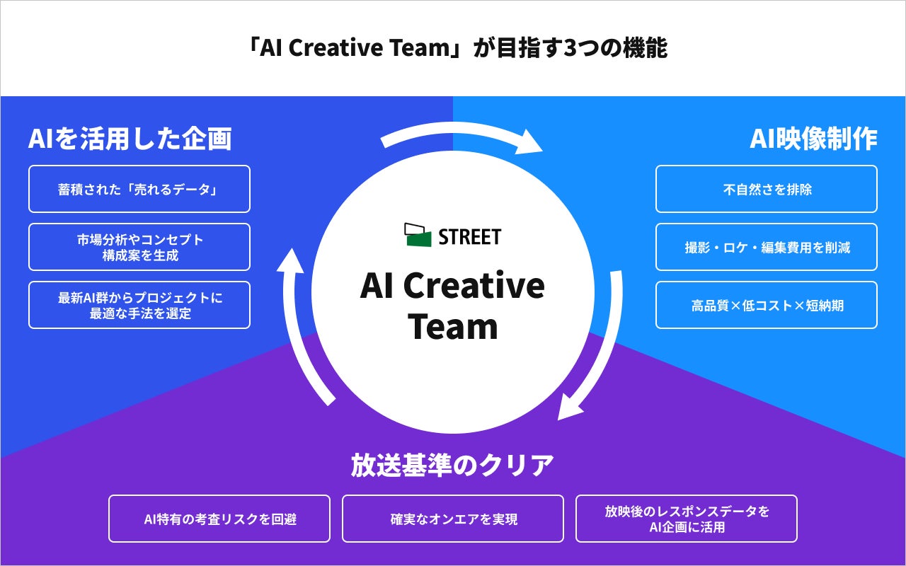 そこでストリートは、独自のAIワークフローを構築し、企画から検証までを一気通貫でマネジメントする生成AI専門組織「AI Creative Team」を発足しました。本組織では、低コストで複数パターンの同時制作を可能にすることで、テレビ通販CM領域における「長尺の運用型CM(獲得型CM)」の実装を支援します。