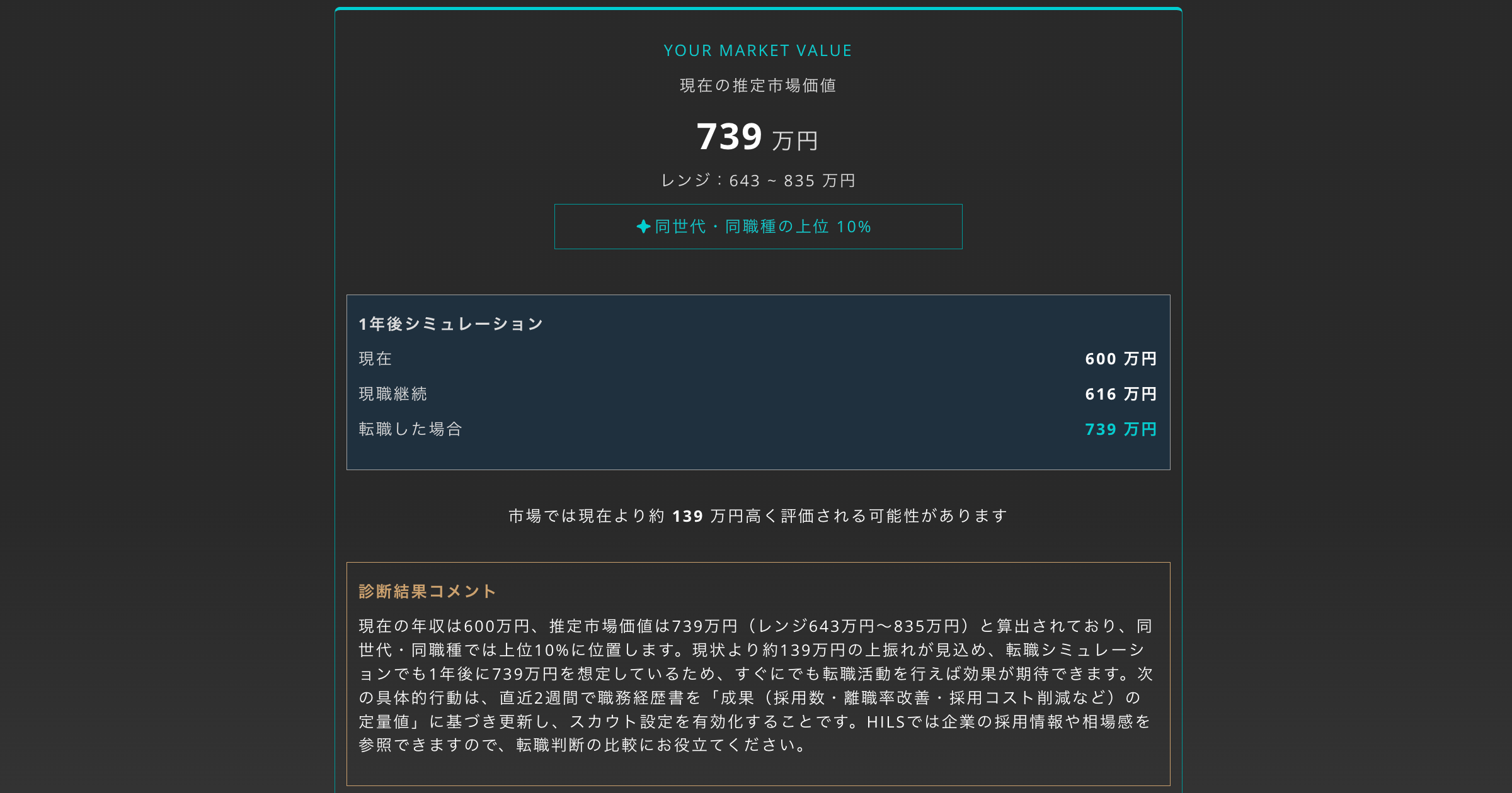 HILSではキャリアの意思決定を支援するため、登録不要・無料で利用できるAI市場価値診断機能を追加しました。厚生労働省「賃金構造基本統計調査」をはじめとする公的データおよび転職市場データをベースに、業種×職種の年収基準値にマネジメント経験などの各種係数を組み合わせた独自のAI算出ロジックにより、客観データに基づいた診断結果を提供します。