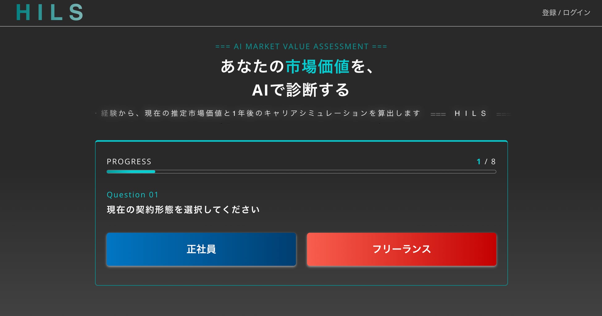 キャリア系マッチングプラットフォーム「HILS」を運営するHilgard株式会社(本社:東京都中央区、代表取締役:大森隆太郎)は、AI市場価値診断機能を2026年4月より提供開始しました。業種・職種・経験年数などわずか8項目に回答するだけで、AIが現在の推定市場価値(年収レンジ)、同世代・同職種内でのポジション、1年後のキャリアシミュレーション、そしてパーソナライズされた診断結果コメントを即時に算出・表示します。