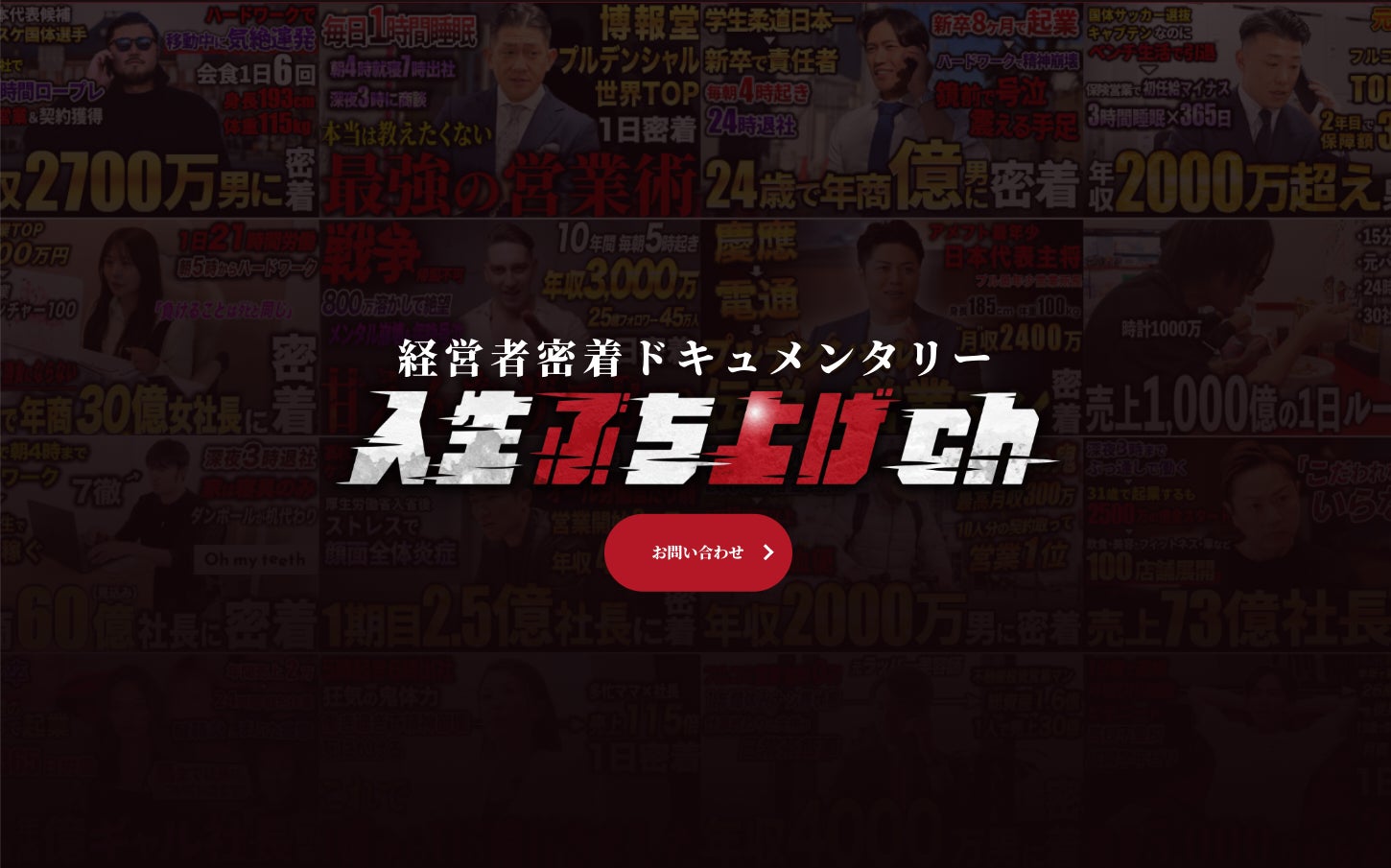 「最幸のキッカケを体現する」をビジョンに掲げ、密着動画制作を通じて企業の魅力を映像化するメディアカンパニー。YouTubeチャンネル「人生ぶち上げch」の運営、企業ブランディング動画制作、採用動画制作、YouTube運用支援を展開。