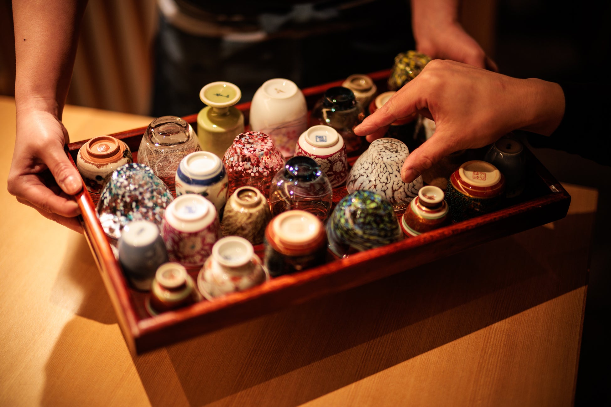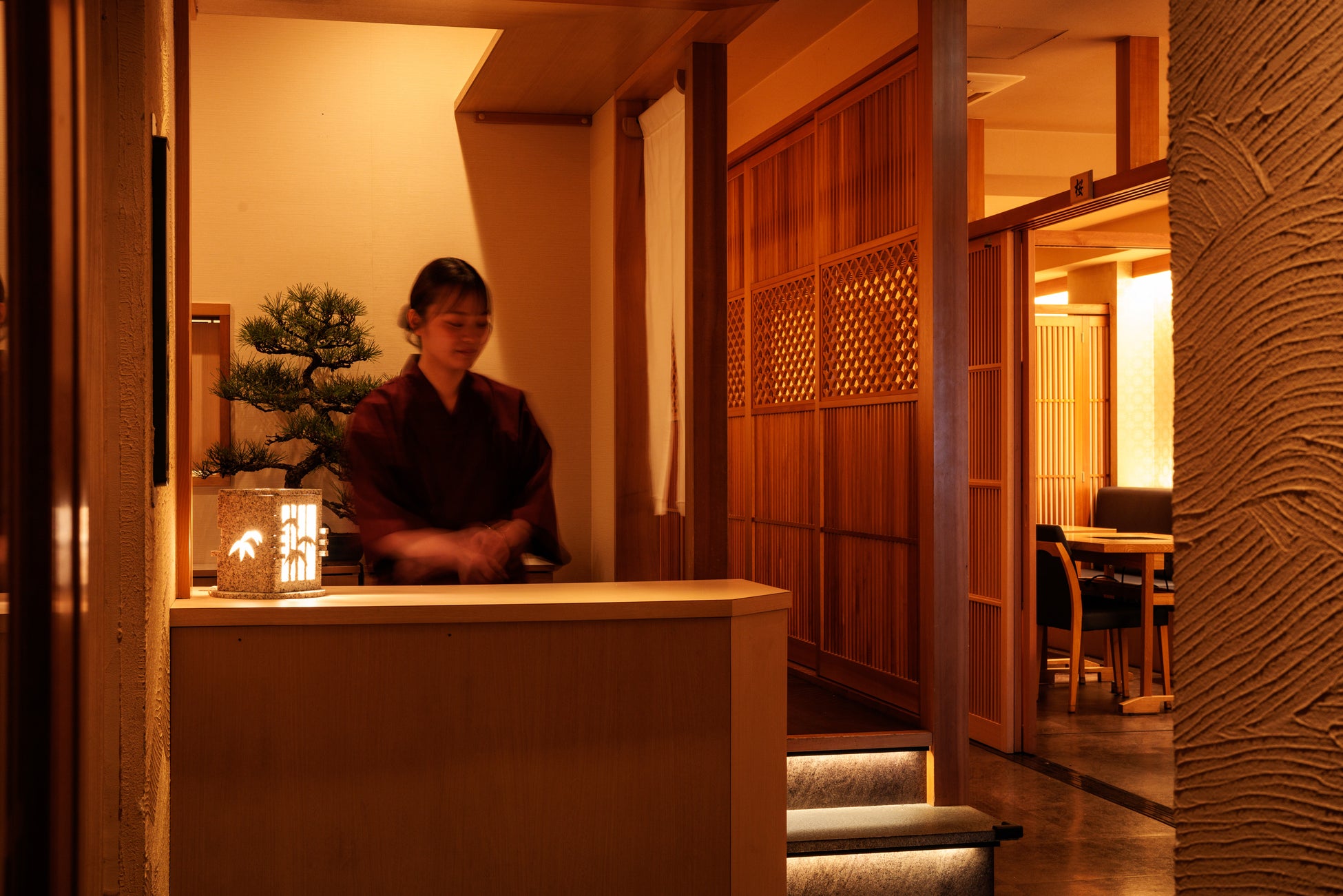 店内は、木の温もりと柔らかな灯りに包まれた上質な和の空間。落ち着いた個室を中心に、大切なひとときをゆったりとお過ごしいただけます。