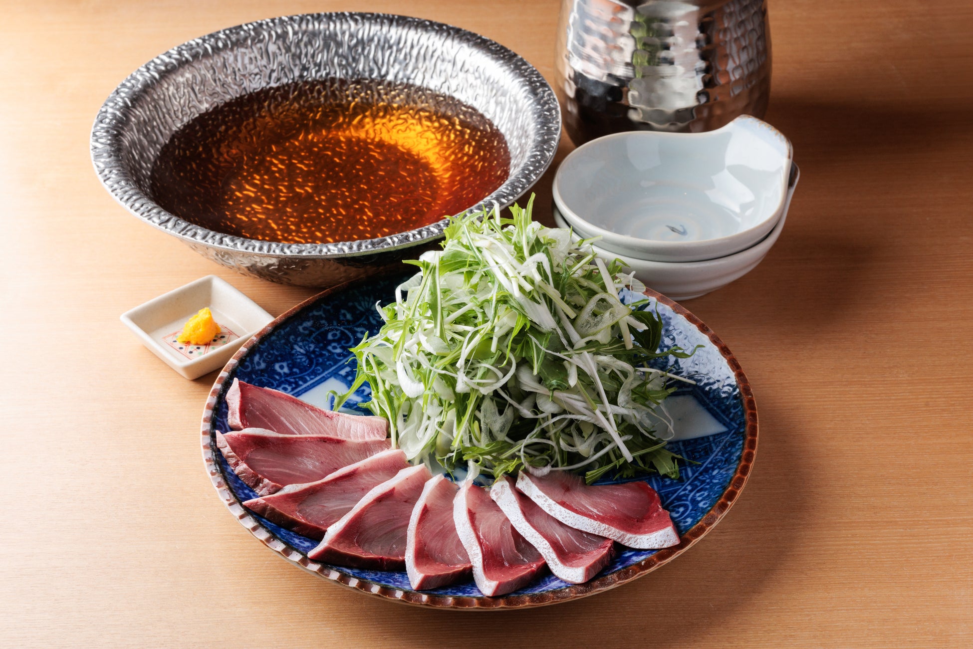 たっぷりの葱と旨み溢れる特製出汁が決め手。新鮮な鮪をさっと潜らせて味わう香りとコクが広がる自慢の逸品。