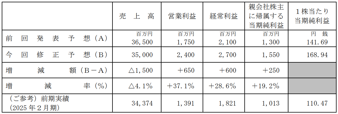 このような状況を踏まえ、2026年2月期通期連結業績予想を上記のとおり修正いたします。