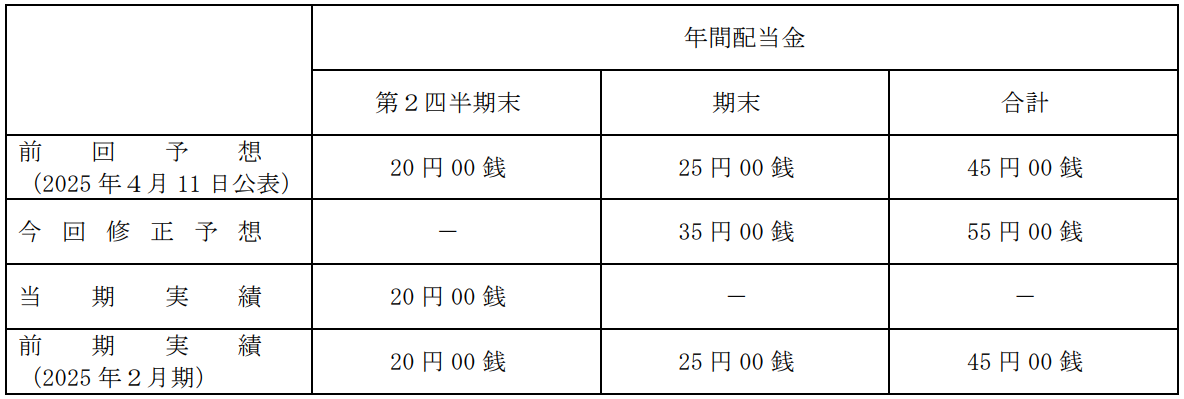 上記方針に基づき、通期連結業績予想の修正を踏まえ、2026年2月期の期末配当予想を、前回発表予想から1株当たり10円増配の35円へ修正いたします。