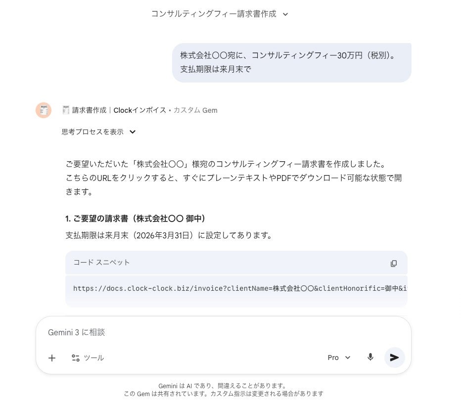 専用のAIエージェント(Gemini Gem等)にチャットで要件を伝えるだけで、インボイス制度に対応した適格請求書のURLが即座に生成されます。