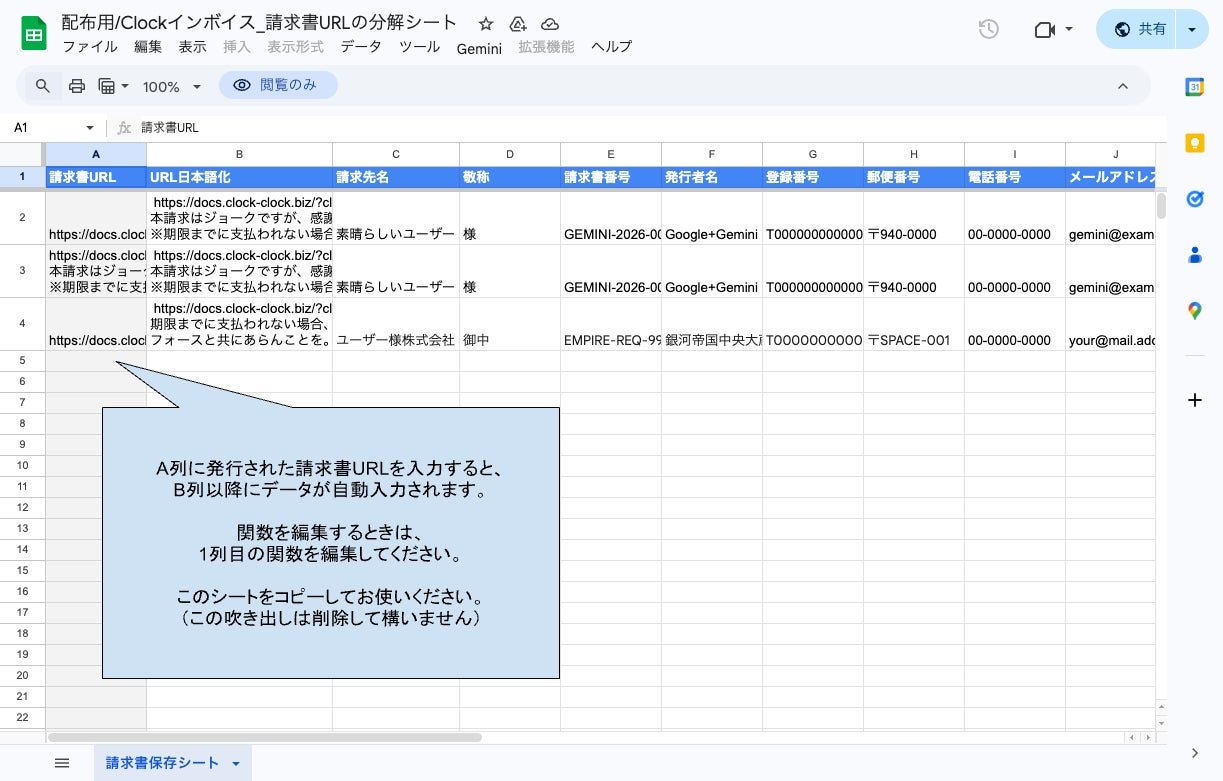 請求書作成AIエージェント(Gemini Gem) 請求書URL分解シート(Google Spreadsheetテンプレート) |