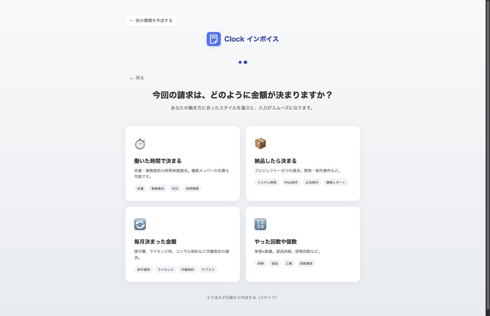 フォーム入力不要の「0秒作成」請求書の作成に、複雑なフォーム入力は不要です。
