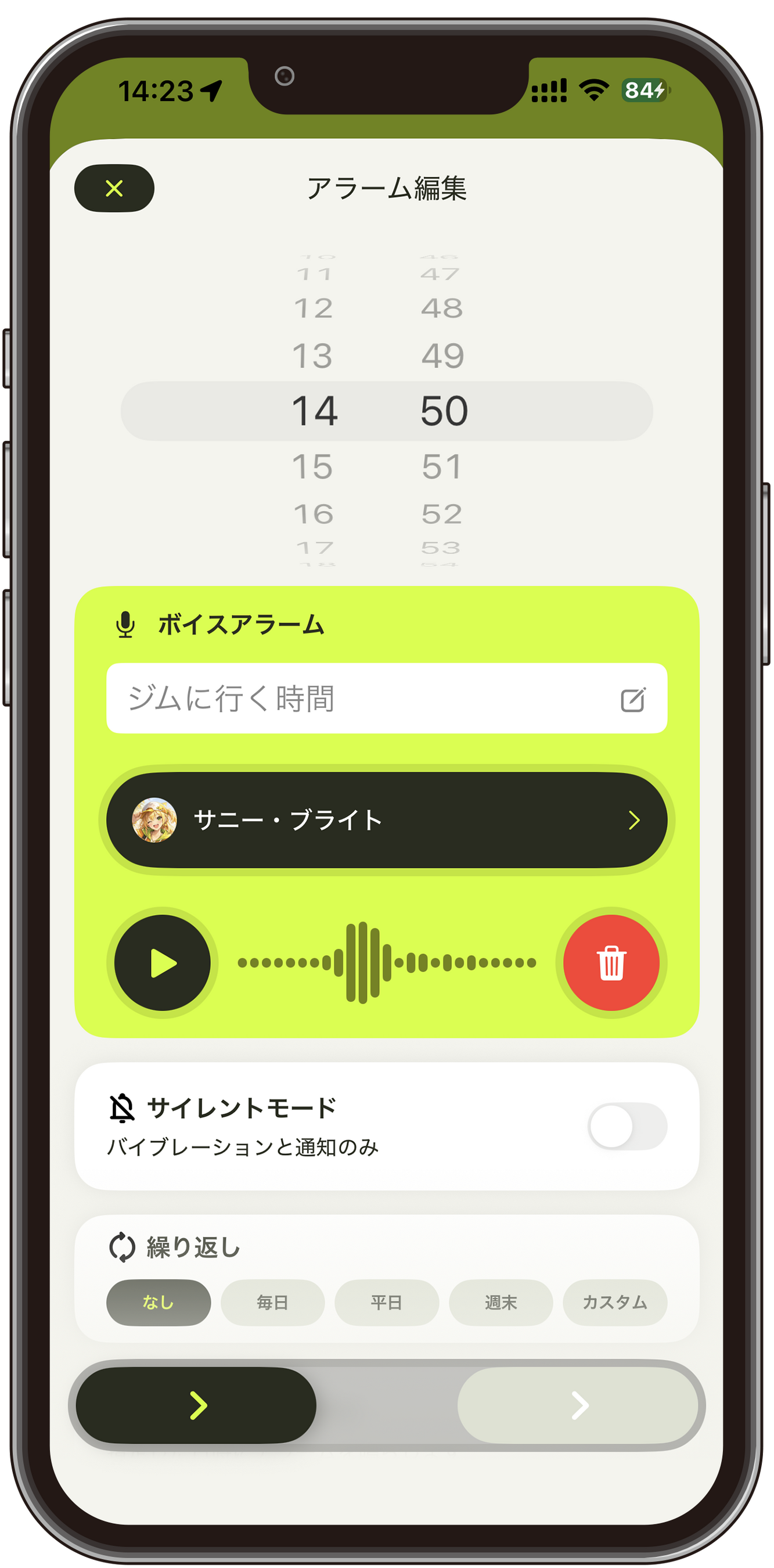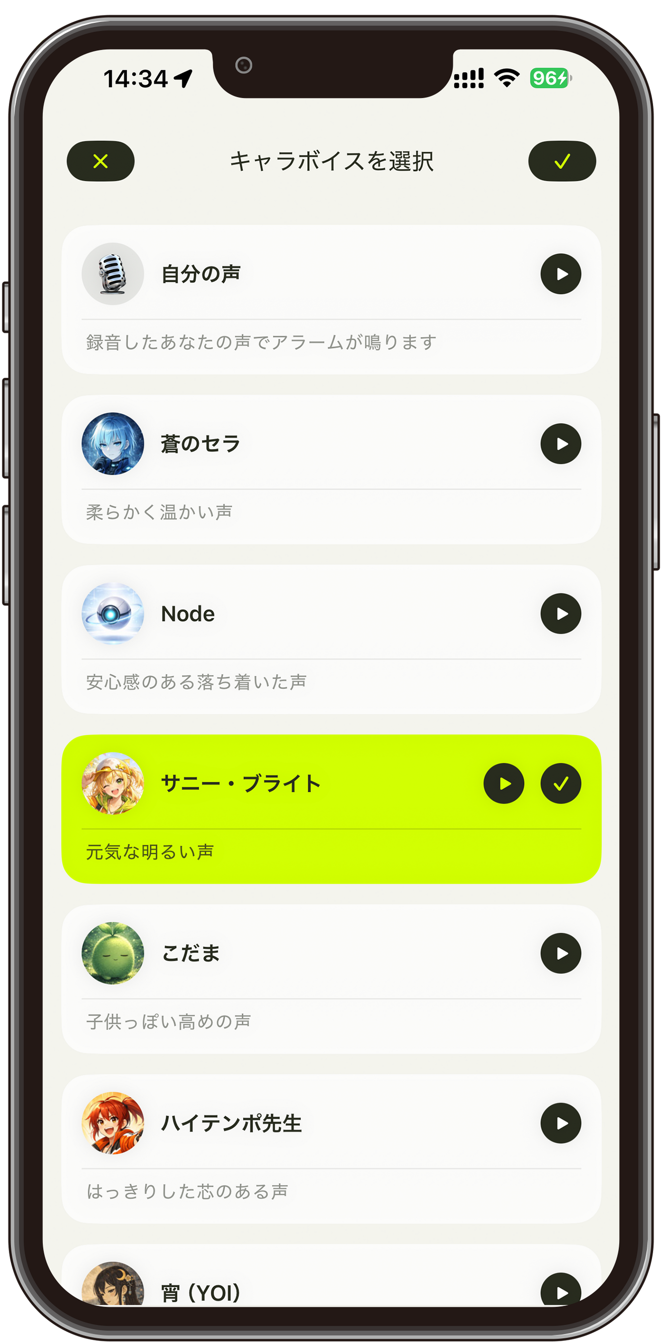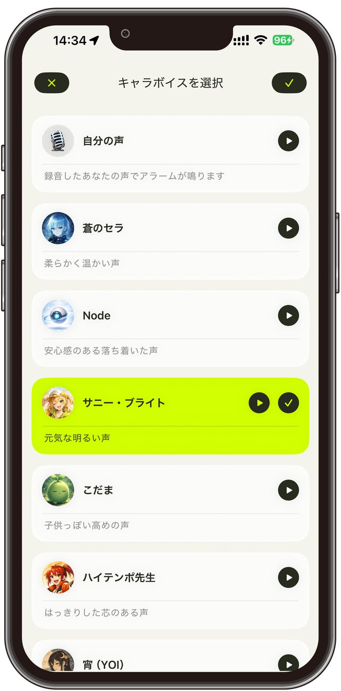 オープンソースの音声合成ソフトウェア「VOICEVOX」と連携し、テキストを入力するだけでキャラクターの声によるアラームを作成できます。自分の声を録音するのに抵抗がある方や、楽しくアラームを使いたい方にも最適です。