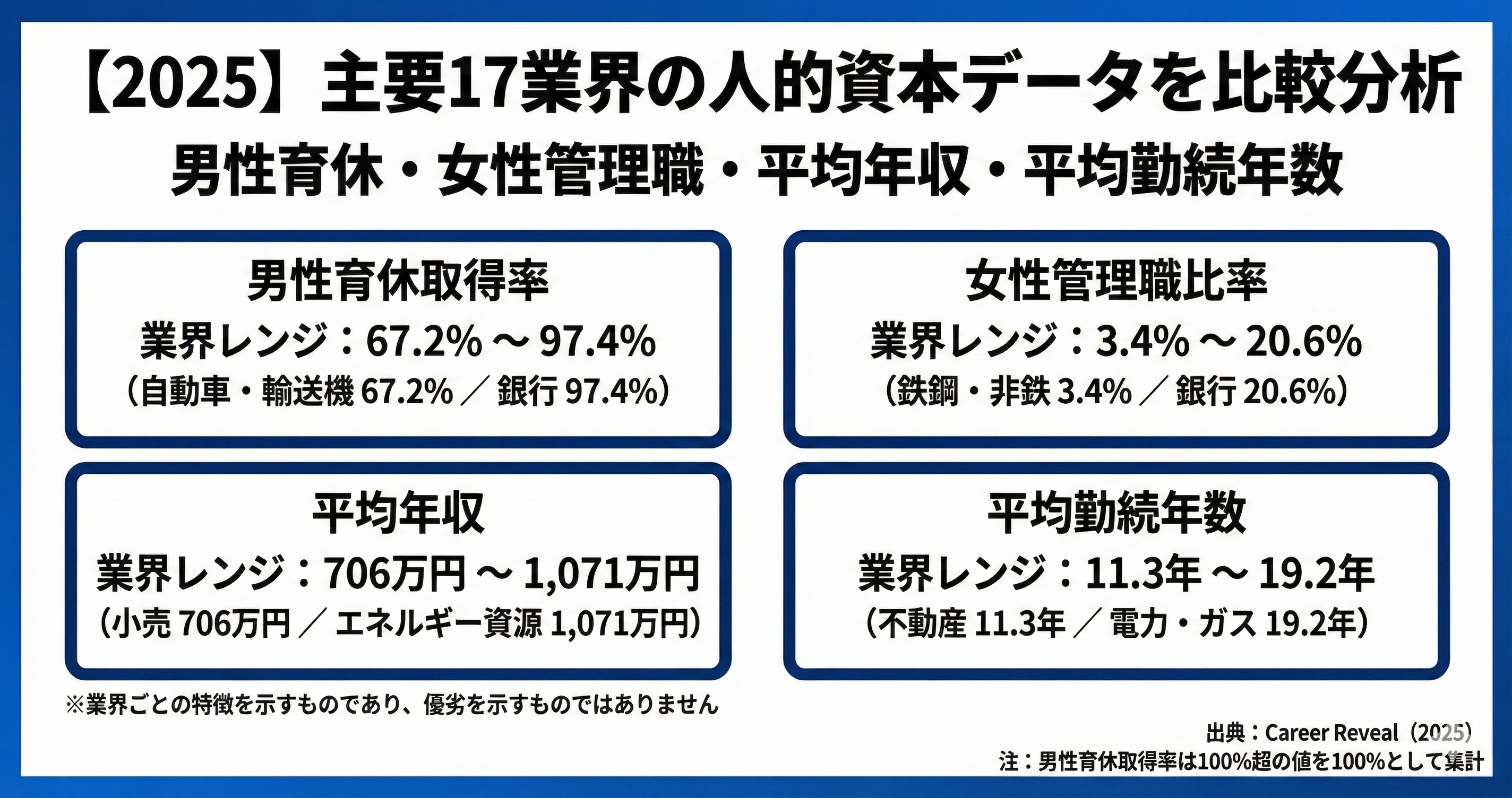 本調査では、男性育休取得率、女性管理職比率、平均年齢、平均勤続年数といった人的資本指標を用い、業界ごとの平均値や分布を整理しています。