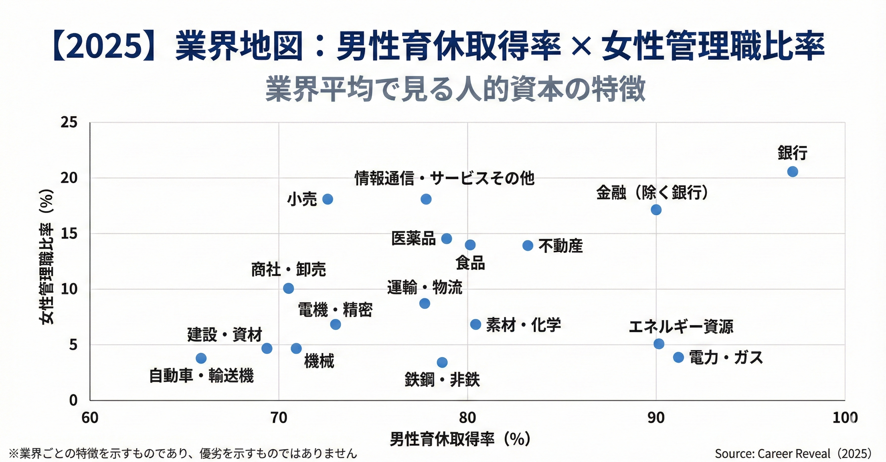 男性育休取得率(横軸)と女性管理職比率(縦軸)を用いた業界散布図では、金融・インフラ系業界が相対的に右上に位置する一方、装置産業系の製造業が左下に位置する傾向が確認されました。