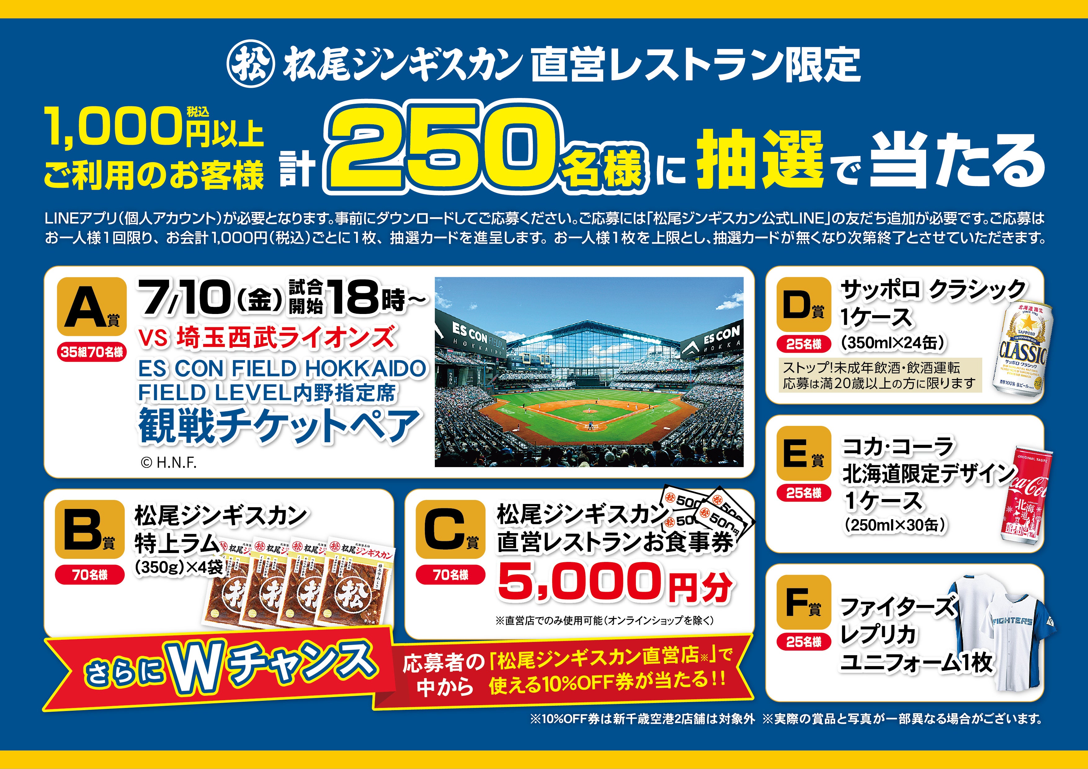 【松尾ジンギスカン創業70周年記念】直営レストラン限定企画!観戦チケットなどが豪華賞品が当たる北海道日本ハムファイターズ応援キャンペーン開催!